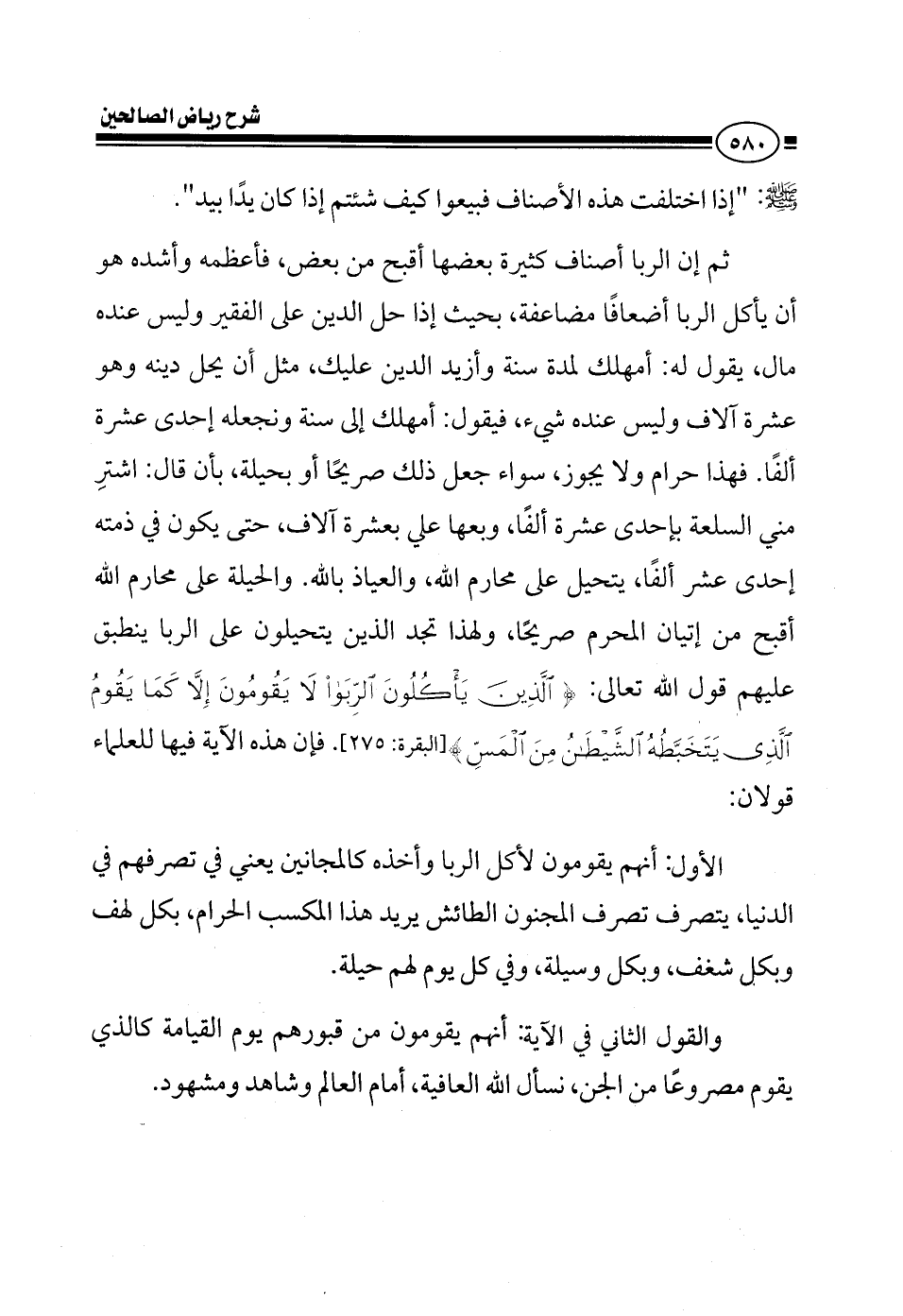 صلى الله عليه وسلم فإذا اختلفت هذه الأصناف فبيعوا كيف شئتم إذا كان يدا بيد ثم إن الربا أصناف كثيرة بعضها أقبح من بعض أعظمه وأشده هو أن يأكل الربا أضعافا مضاعفة بحيث إذا حل الدين على الفقير وليس عنده مال يقول له أنذرك لمدة سنة وأزيدك أزيد الدين عليك مثل أن يحل دينه وهو عشر آلاف وليس عنده شيء فيقول أنذرك إلى سنة ونجعله أحد عشر ألفا هذا حرام ولا يجوز سواء جعل ذلك صريحا أو بحيلة بأن قال اشتر مني السلعة بأحد عشر ألفا وبعها علي بعشرة آلاف حتى يكون في ذمته إحد عشر ألفا يتحيل على محارم الله والعياذ بالله والحيلة على محارم الله أقبح من إتيان المحرم صريحا ولهذا تجد الذين يتحيلون على الربا ينطبق عليهم قول الله تعالى {الذين يأكلون الربا لا يقومون إلا كما يقوم الذي يتخبطه الشيطان من المس} فإذا هذه الآية فيها للعلماء قولان الأول أنهم يقومون لأكل الربا وأخذه كالمجانين يعني في تصرفهم في الدنيا يتصرف تصرف المجنون الطائش يريد هذا المكسب الحرام نجد هؤلاء الذي يتحيلون على الربا يتصرفون تصرف المجانين بكل لهف وبكل شغف وبكل وسيلة وفي كل يوم لهم حيلة والقول الثاني في الآية أنهم يقومون من قبورهم يوم القيامة كالذي يقوم مصروعا من الجن نسأل الله العافية أمام العالم وشاهد ومشهود