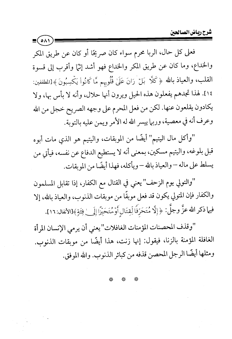 فعلى كل حال الربا محرم سواء كان صريحا أو كان عن طريق المكر والخداع وما كان عن طريق المكر والخداع فهو أشد إثما وأقرب إلى قسوة القلب والعياذ بالله {كلا بل ران على قلوبهم ما كانوا يكسبون} ولهذا تجدهم يفعلون هذه الحيل ويرون أنها حلال وأنه لا بأس بها ولا يكادون يقلعون عنها لكن من فعل المحرم على وجهه الصريح خجل من الله وعرف أنه في معصية وربما ييسر الله له الأمر ويمن عليه بالتوبة وأكل مال اليتيم أيضا من الموبقات واليتيم هو الذي مات أبوه قبل بلوغه واليتيم مسكين بمعنى أنه لا يستطيع الدفاع عن نفسه فيأتي من يسلط على ماله ويأكله هذا أيضا من الموبقات والتولي يوم الزحف يعني القتال مع الكفار إذا تقابل المسلمون والكفار فإن المتولي يكون قد فعل موبقا من موبقات الذنوب والعياذ بالله إلا فيما ذكر الله عز وجل {إلا متحرفا لقتال أو متحيزا إلى فئة} وقذف المحصنات المؤمنات الغافلات يعني أن يرمي الإنسان المرأة الغافلة المؤمنة بالزنا فيقول إنها زنت هذا أيضا من موبقات الذنوب ومثلها أيضا الرجل المحصن قذفه من كبائر الذنوب والله الموفق