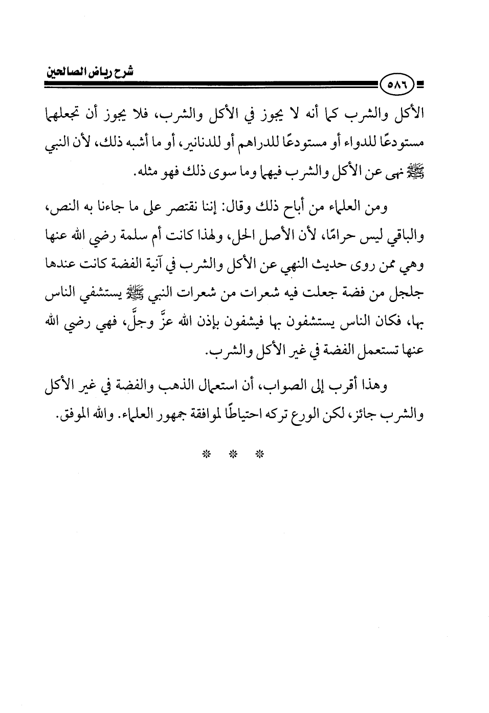 الأكل والشرب كما أنه لا يجوز في الأكل والشرب فلا يجوز أن تجعلهما مستودعا للدواء أو مستودعا للدراهم أو للدنانير أو ما أشبه ذلك لأن النبي صلى الله عليه وسلم نهى عن الأكل والشرب فيهما وما سوى ذلك فهو مثله ومن العلماء من أباح ذلك وقال إننا نقتصر على ما جاءنا به النص والباقي ليس حراما لأن الأصل الحل ولهذا كانت أم سلمة رضي الله عنها وهي ممن روى حديث النهي عن الأكل والشرب في آنية الفضة كانت عندها جلجل من فضة وعاء البيبسي وشبهه جلجل من فضة جعلت فيه شعرات من شعرات النبي صلى الله عليه وسلم يستشفي الناس بها إذا مرض الإنسان أتوا إليها وجعلت في هذا الجلجل ماء وراجته في الشعر وشربه المريض فيشفى بإذن الله فهي رضي الله عنها تستعمل الفضة في غير الأكل والشرب وهذا أقرب إلى الصواب أن استعمال الذهب والفضة في غير الأكل والشرب جائز لكن الورع تركه احتياطا لموافقة جمهور العلماء والله الموفق