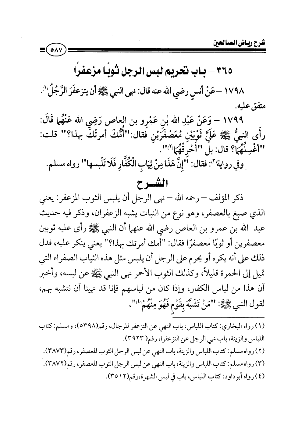 1799 - وعن عبد الله بن عمرو بن العاص رضي الله عنهما قال: رأى النبي صلى الله عليه وسلم علي ثوبين معصفرين فقال: أمك أمرتك بهذا؟ قلت اغسلهما قال بل احرقهما وفي رواية فقال إن هذا من ثياب الكفار فلا تلبسها رواه مسلم.