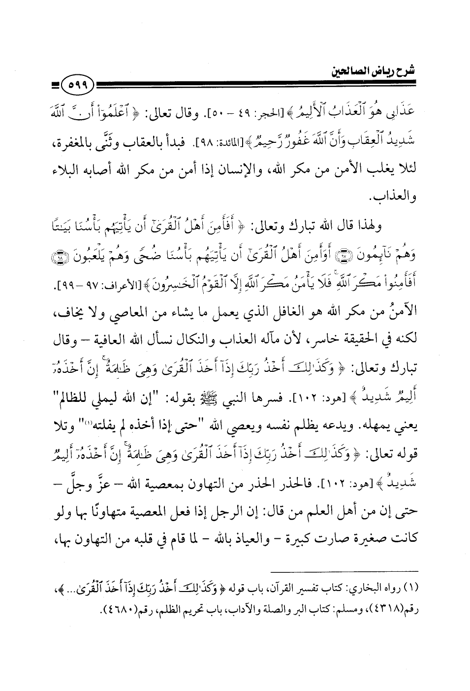 عذابي هو العذاب الأليم} وقال تعالى {اعلموا أن الله شديد العقاب وأن الله غفور رحيم} فبدأ بالعقاب وثنى بالمغفرة لئلا يغلب الأمن من مكر الله والإنسان إذا أمن من مكر الله أصابه البلاء والعذاب ولهذا قال الله تبارك وتعالى {أفأمن أهل القرى أن يأتيهم بأسنا بياتا وهم نائمون أو أمن أهل القرى أن يأتيهم بأسنا ضحى وهم يلعبون أفأمنوا مكر الله فلا يأمن مكر الله إلا القوم الخاسرون} الآمن من مكر الله هو المغالي وإنه يعمل ما يشاء من المعاصي ولا يخافه لكنه في الحقيقة خاسر لأن مآله العذاب والنكال نسأل الله العافية وقال تبارك وتعالى {وكذلك أخذ ربك إذا أخذ القرى وهي ظالمة إن أخذه أليم شديد} فسرها النبي صلى الله عليه وسلم بقوله إن الله ليملي للظالم يعني يمهله ويدعه يظلم نفسه حتى إذا أخذه لم يفلته وتلا قوله تعالى {وكذلك أخذ ربك إذا أخذ القرى وهي ظالمة إن أخذه أليم شديد} فالحذر الحذر من التهاون بمعصية الله عز وجل حتى إن من أهل العلم من قال إن الرجل إذا فعل المعصية متهاونا بها ولو كانت صغيرة صارت كبيرة والعياذ بالله لما قام في قلبه من التهاون بها