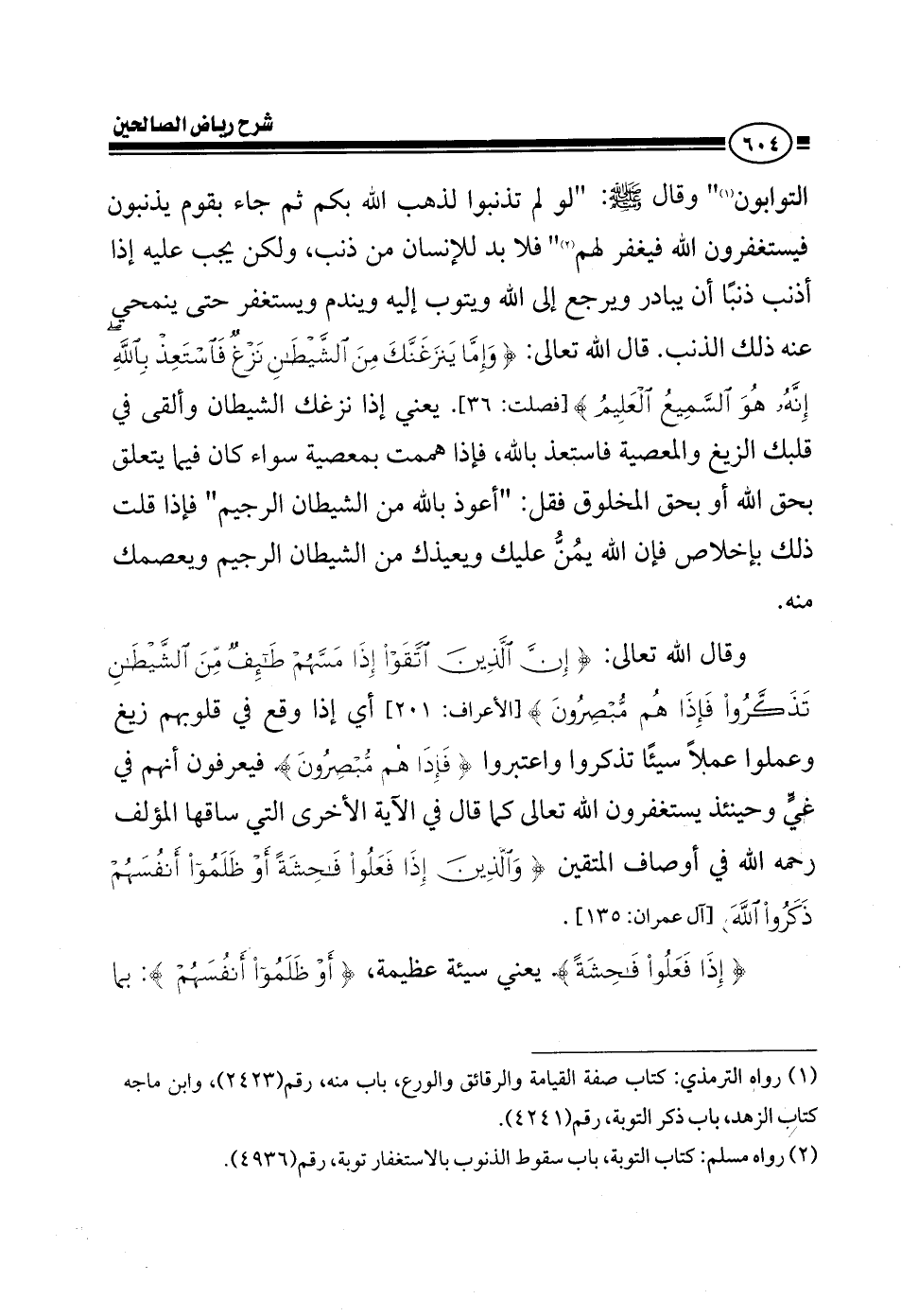 التوابون وقال صلى الله عليه وسلم لو لم تذنبوا لذهب الله بكم ثم جاء بقوم يذنبون فيستغفرون الله فيغفر لهم فلابد للإنسان من ذنب ولكن ماذا يصنع يجب عليه إذا أذنب ذنبا أن يرجع إلى الله ويتوب إليه ويندم ويستغفر حتى ينمحي عنه ذلك الذنب قال الله تعالى وإما ينزغنك من الشيطان نزغ فاستعذ بالله يعني إذا نزغك الشيطان وألقى في قلبك الزيع والمعصية فاستعذ بالله فإذا هممت بمعصية سواء كانت فيما يتعلق بحق الله أو فيما يتعلق بحق المخلوق فقل {فاستعذ بالله من الشيطان الرجيم} فإذا قلت ذلك بإخلاص فإن الله يعينك ويعيذك من الشيطان الرجيم ويعصمك منه وقال الله تعالى {إذا مسهم طائف من الشيطان تذكروا فإذا هم مبصرون} أي وقع في قلوبهم زيغ وعملوا عملا سيئا تذكروا اعتبروا {فإذا هم مبصرون} فيعرفون أنهم في غي وحينئذ يستغفرون الله تعالى كما قال في الآية الأخرى التي ساقها المؤلف رحمه الله في أوصاف المتقين {والذين إذا فعلوا فاحشة أو ظلموا أنفسهم ذكروا الله} {إذا فعلوا فاحشة} يعني سيئة عظيمة أو ظلموا أنفسهم بما
