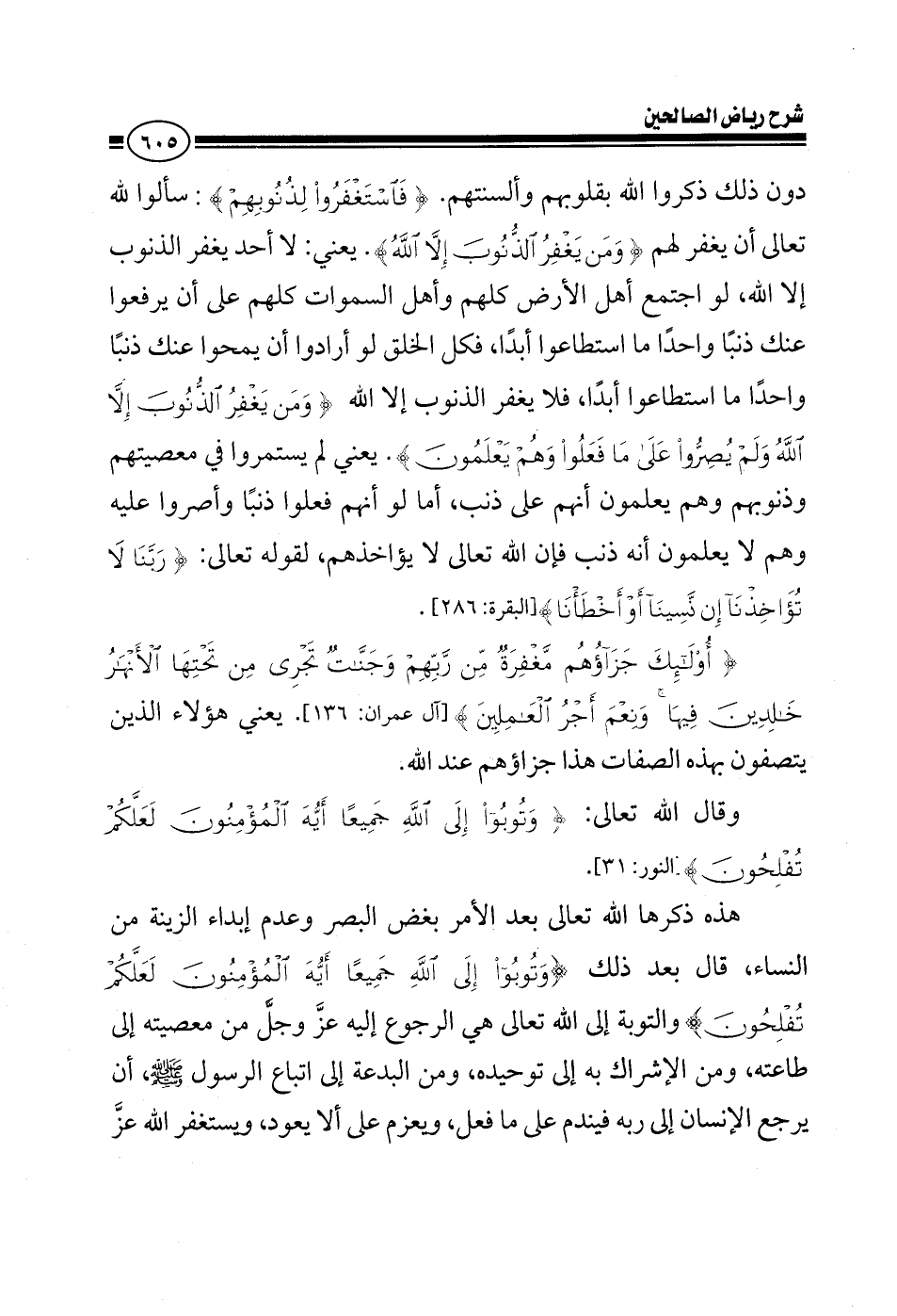 دون ذلك ذكروا الله بقلوبهم وألسنتهم {فاستغفروا لذنوبهم} سألوا الله تعالى أن يغفر لهم {ومن يغفر الذنوب إلا الله} يعني لا أحد يغفر الذنوب إلا الله لو اجتمع أهل الأرض كلهم وأهل السماوات كلهم على أن يرفعوا عنك ذنبا واحدا ما استطاعوا أبدا كل الخلق لو أرادوا أن يمحوا عنك ذنبا واحدا ما استطاعوا لا يغفر الذنوب إلا الله {ولم يصروا على ما فعلوا وهم يعلمون} يعني لم يستمروا في معصيتهم وذنوبهم وهم يعلمون أنهم على ذنب أما لو أنهم فعلوا ذنبا وأصروا عليه وهم لا يعلمون أنه ذنب فإن الله تعالى لا يؤاخذهم لقوله تعالى {ربنا لا تؤاخذنا إن نسينا أو أخطأنا} {أولئك جزاؤهم مغفرة من ربهم وجنات تجري من تحتها الأنهار خالدين فيها ونعم أجر العاملين} يعني هؤلاء الذين يتصفون بهذه الصفات هذا جزاؤهم عند الله وقال الله تعالى {وتوبوا إلى الله جميعا أيها المؤمنون لعلكم تفلحون} توبوا إلى الله هذه ذكرها الله تعالى بعد الأمر بغض البصر وعدم إبداء الزينة من النساء قال بعد ذلك {وتوبوا إلى الله جميعا} والتوبة إلى الله تعالى هي الرجوع إليه عز وجل من معصيته إلى طاعته ومن الإشراك به إلى توحيده ومن البدعة إلى اتباع الرسول صلى الله عليه وسلم أن يرجع الإنسان إلى ربه فيندم على ما فعل ويعزم على ألا يعود ويستغفر الله عز