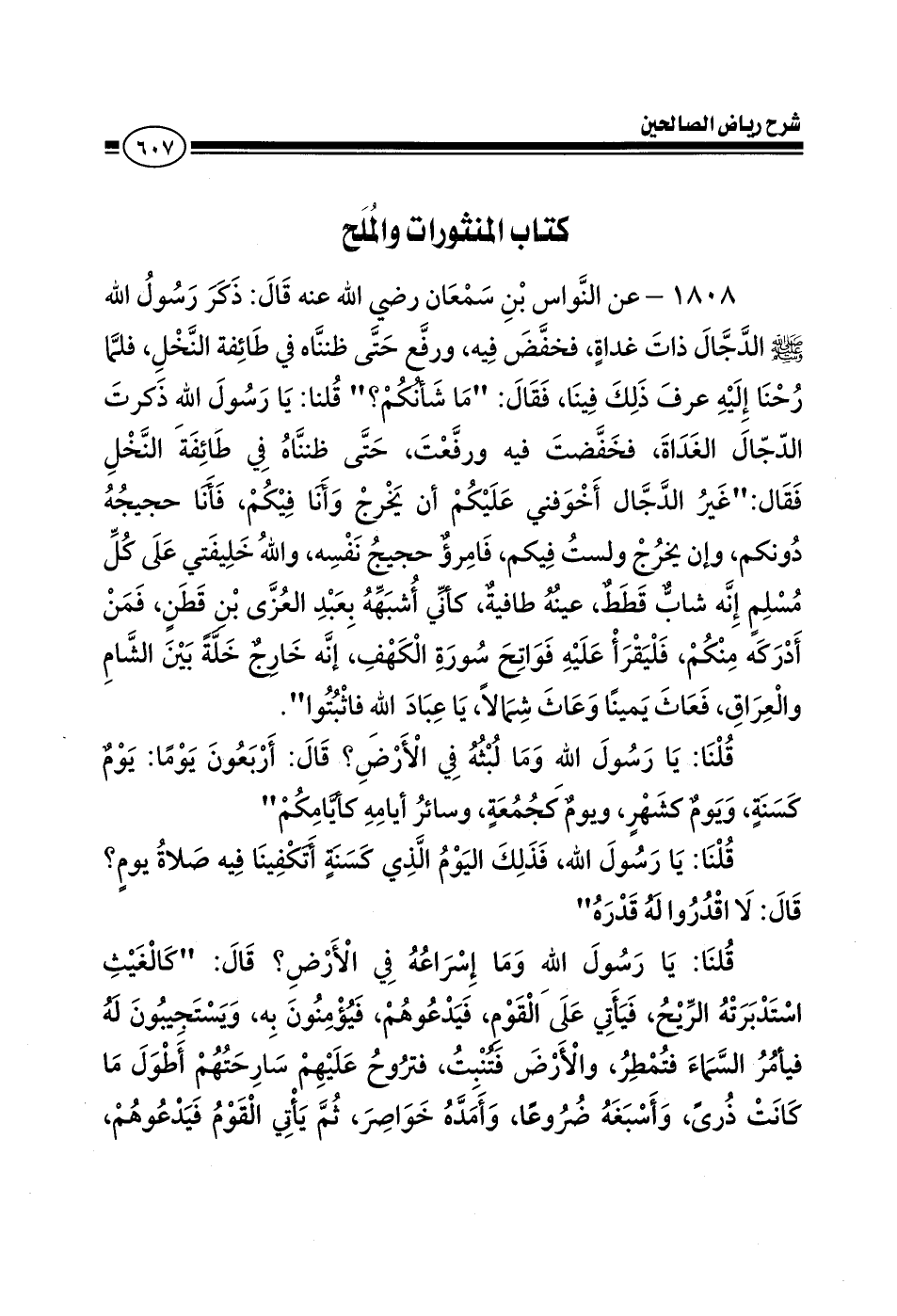 1808 - عن النواس بن سمعان رضي الله عنه قال: ذكر رسول الله صلى الله عليه وسلم الدجال ذات غداة فخفض فيه ورفع حتى ظنناه في طائفة النخل فلما رحنا إليه عرف ذلك فينا فقال ما شأنكم؟ قلنا يا رسول الله ذكرت الدجال الغداة فخفضت فيه ورفعت حتى ظنناه في طائفة النخل فقال غير الدجال أخوفني عليكم إن يخرج وأنا فيكم فأنا حجيجه دونكم وإن يخرج ولست فيكم فكل امريئ حجيج نفسه والله خليفتي على كل مسلم إنه شاب قطط عينه طافية كأني أشبهه بعبد العزى بن قطن فمن أدركه منكم فليقرأ عليه فواتح سورة الكهف إنه خارج خلة بين الشام والعراق فعاث يمينا وعاث شمالا يا عباد الله فاثبتوا قلنا يا رسول الله وما لبثه في الأرض قال أربعون يوما يوم كسنة ويوم كشهر ويوم كجمعة وسائر أيامه كأيامكم قلنا يا رسول الله فذلك اليوم الذي كسنة أتكفينا فيه صلاة يوم قال لا اقدروا له قدره قلنا يا رسول الله وما إسراعه في الأرض قال كالغيث استدبرته الريح فيأتي على القوم فيدعوهم فيؤمنون به ويستجيبون له فيأمر السماء فتمطر والأرض فتنبت فتروح عليهم سارحتهم أطول ما كانت ذرى وأسبغه ضروعا وأمده خواصر ثم يأتي القوم فيدعوهم