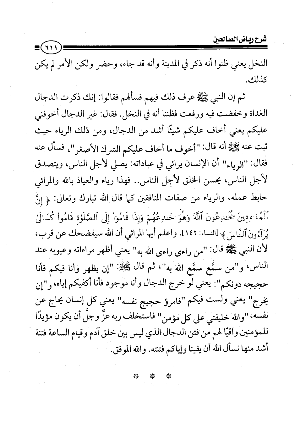 النخل يعني ظنوا أنه ذكر في المدينة وأنه قد جاء ولكن الأمر لم يكن كذلك ثم إن النبي صلى الله عليه وسلم عرف ذلك فيهم فسألهم فقالوا إنك ذكرت الدجال الغداة وخفضت فيه ورفعت فظننا أنه في النخل فقال غير الدجال أخوفني عليكم يعني أخاف عليكم شيئا أشد من الدجال ومن ذلك الرياء حيث ثبت عنه صلى الله عليه وسلم أنه قال أخوف ما أخاف عليكم الشرك الأصغر فسئل عنه فقال الرياء أن الإنسان يرائي في عباداته يصلي لأجل الناس يتصدق لأجل الناس يحسن الخلق لأجل الناس..