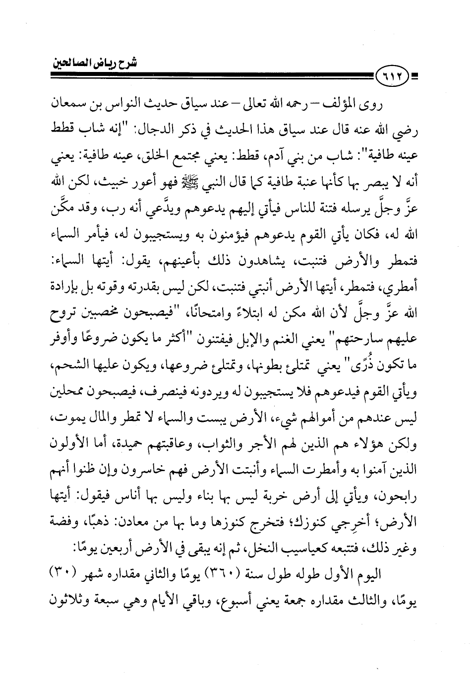 روى المؤلف رحمه الله تعالى عند سياق حديث النواس بن سمعان رضي الله عنه في كتابه رياض الصالحين قال عند سياق هذا الحديث في ذكر الدجال إنه شاب قطط عينه طافية شاب من بني آدم قطط يعني مجتمع الخلق عينه طافية يعني أنه لا يبصر بها كأنه عنبة طافية كما قال النبي صلى الله عليه وسلم فهو أعور خبيث لكن الله عز وجل يرسله فتنة للناس فيأتي إليهم يدعوهم ويدعي أنه رب وقد مكن الله له فكان يأتي القوم يدعوهم فيستجيبون له ويؤمنون به فيأمر السماء فتمطر والأرض فتنبت يشاهدون ذلك بأعينهم يقول أيتها السماء أمطري فتمطر أيتها الأرض أنبتي فتنبت لكن ليس بقدرته وقوته بل بإرادة الله عز وجل لكن الله مكن له ابتلاء وامتحانا فيصبحون تروح عليهم سارحتهم يعني الغنم والإبل أكثر ما يكون ذروعا وأوفر ما تكون ذرى وأمدها خواصر تمتلئ بطونها وتمتلئ ضروعها ويكون عليها الشحم ويأتي القوم فيدعوهم فلا يستجيبون له يردونه فينصرف فيصبحون ممحلين ليس لهم من أموالهم شيء الأرض خربت والسماء لا تمطر والمال يمور ولكن هؤلاء هم الذين لهم الأجر والثواب وعاقبتهم حميدة أما الأولون الذين آمنوا به وأمطرت السماء وأنبتت الأرض فهم خاسرون وإن ظنوا أنهم رابحون ويأتي إلى الخربة أرض خربة ما بها بناء وما بها أناس فيقول أيتها الأرض أخرجي كنوزك فتخرج كنوزها وما بها من معادن من ذهب وفضة وغير ذلك فتتبعه كيعاسيب النحل ثم إنه يبقى في الأرض أربعين يوما اليوم الأول طوله طول سنة كم شهرا إثنا عشر شهرا 360 يوما هذا اليوم الأول يوم والثاني مقداره شهر 30 يوما والثالث مقداره جمعة يعني أسبوعا وباقي الأيام وهي سبعة وثلاثون