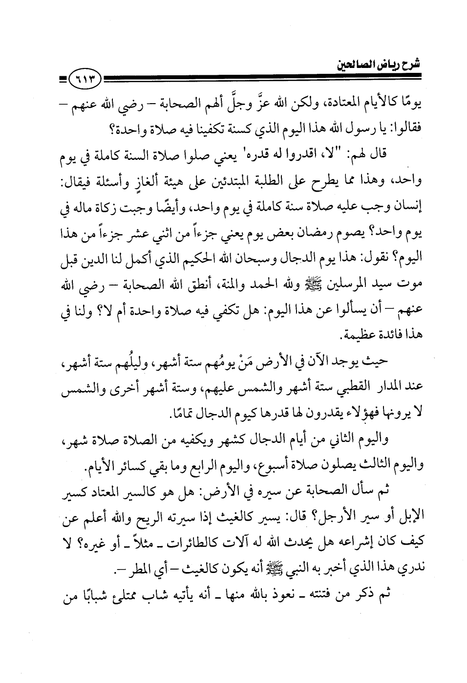 يوما كالأيام المعتادة ولكن الله عز وجل نبه الصحابة قالوا يا رسول الله هذا اليوم الذي كسنة تكفينا فيه صلاة واحدة فيكون عليهم في اليوم كم خمس صلوات قال لهم لا اقدروا له قدره يعني صلوا صلاة السنة كاملة في يوم واحد وهذا مما يؤخذ به يقال إنسان وجب عليه صلاة سنة كاملة في يوم واحد وأيضا يؤخذ به من جهة أخرى وجبت زكاة ماله في يوم واحد وأيضا فيقال يصوم رمضان بعض يوم يعني جزءا من اثني عشر جزءا من هذا اليوم نقول هذا يوم الدجال وسبحان الله الحكيم الذي أكمل لنا الدين قبل أن يموت سيد المرسلين صلى الله عليه وسلم أنطق الله الصحابة أن يسألوا عن هذا اليوم هل تكفي فيه صلاة واحدة أم لا يوجد الآن في الأرض من يومهم ستة أشهر وليلهم ستة أشهر عند المدار القطبي ستة أشهر والشمس عليهم وستة أخرى والشمس لا يرونها فكيف يصلي هؤلاء يصلون صلاة يوم وليل فقط أو يقدرون لها قدرها نقول يقدرون لها قدرها كيوم الدجال تماما اليوم الثاني من أيام الدجال كشهر كيف تكون فيه الصلاة..