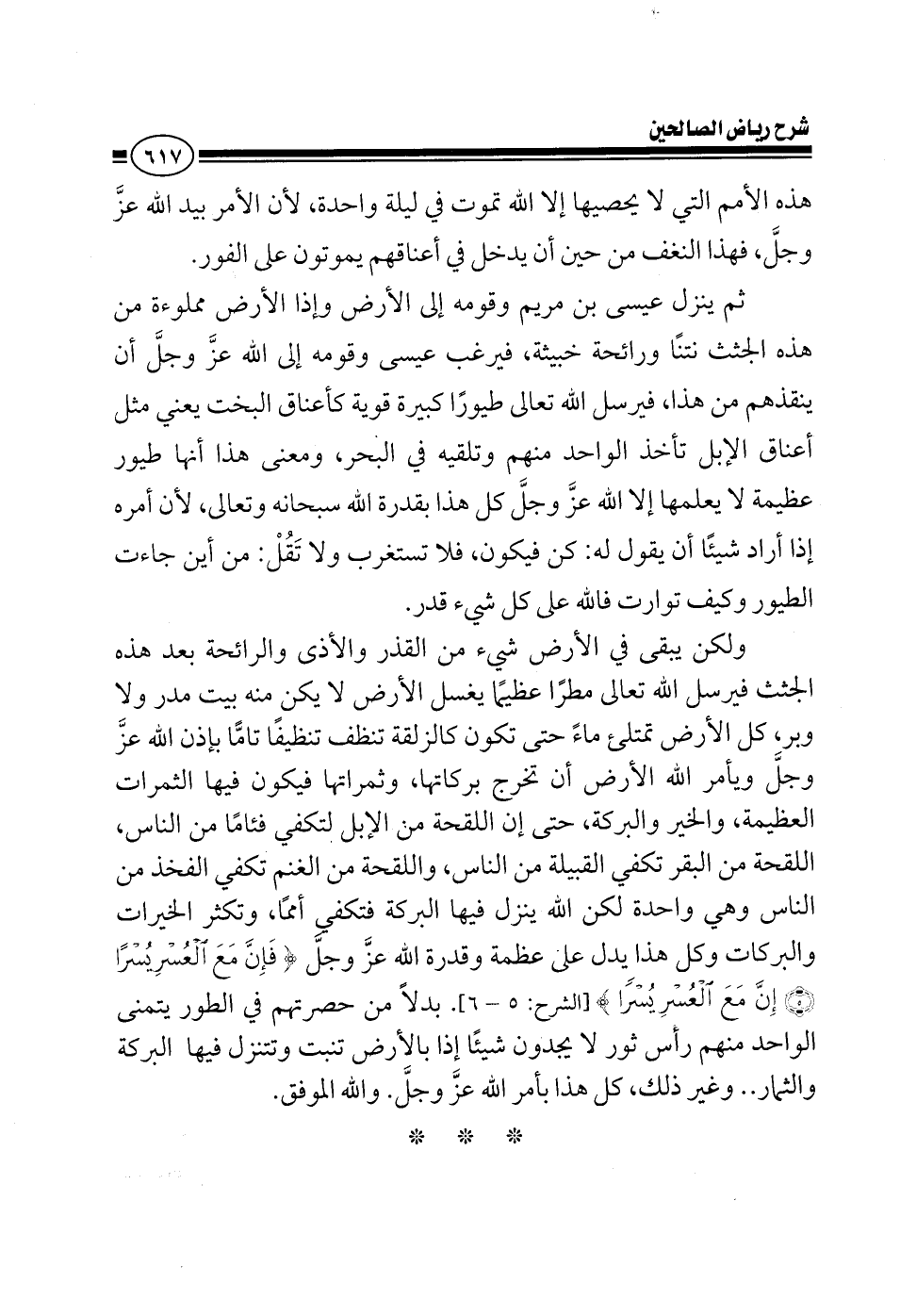 لكن كما تعلمون لابد أن يبقى في الأرض شيء من القذر والأذى والرائحة بعد هذه الجثث فيرسل الله تعالى مطرا عظيما يغسل الأرض لا يكن منه مدر ولا وبر كل الأرض تمتلئ ماء حتى تكون كالزلقة تنظف تنظيفا تاما بإذن الله عز وجل ويأمر الله الأرض أن تخرج بركاتها وثمراتها فيكون فيها الثمرات العظيمة والخير والبركة حتى إن اللقحة من الإبل لتكفي فئاما من الناس ومن البقر تكفي القبيلة من الناس ومن الغنم تكفي الفخذ من الناس وهي واحدة لكن الله ينزل فيها البركة فتكفي أمما وتكثر الخيرات والبركات وكل هذا يدل على عظمة وقدرة الله عز وجل {فإن مع العسر يسرا إن مع العسر يسرا} بدلا من حصرتهم في الطور لا يجدون شيئا إذا بالأرض تنبت وتنزل فيها البركة والثمار ...