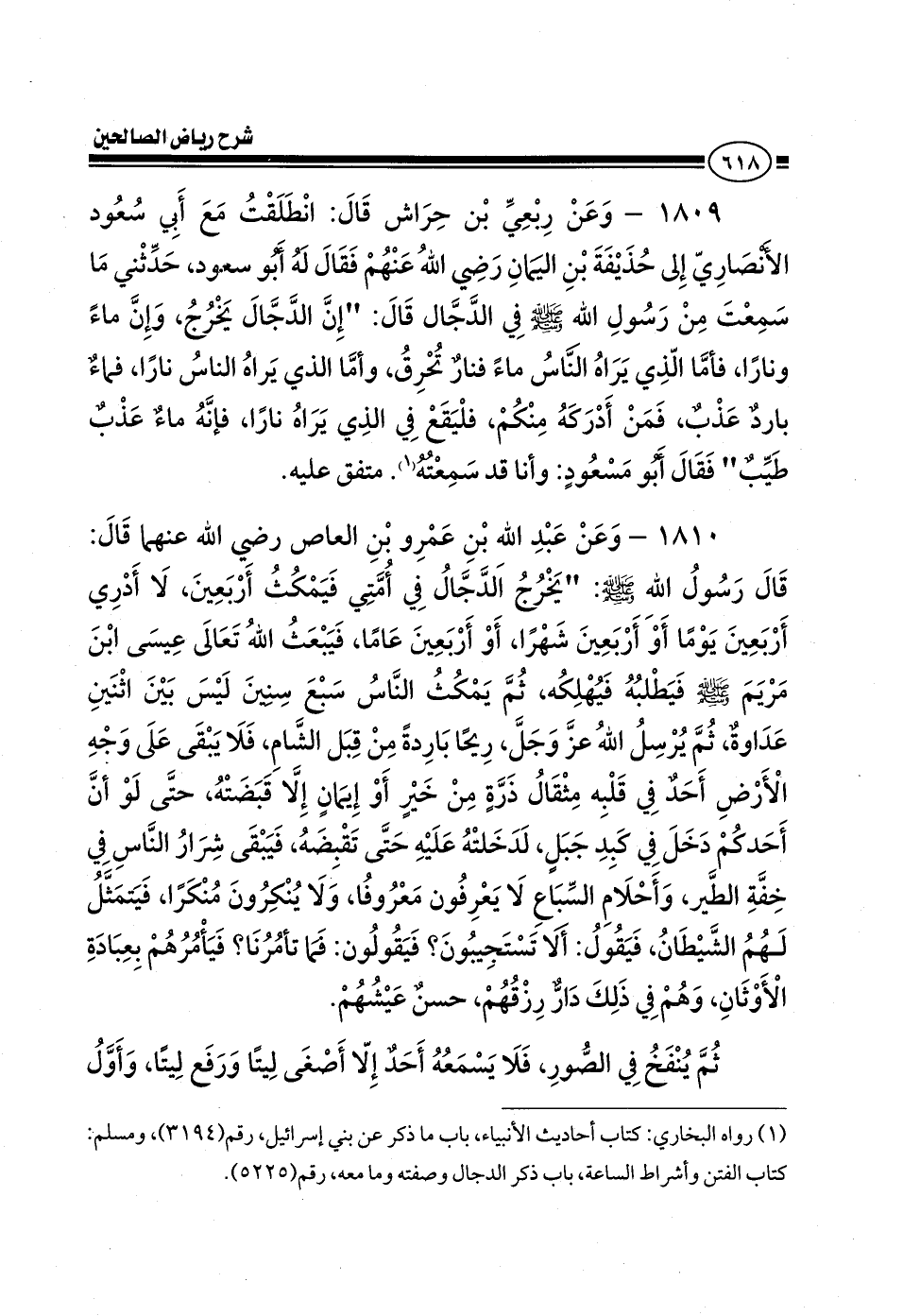 1810 - وعن عبد الله بن عمرو بن العاص رضي الله عنهما قال قال رسول الله صلى الله عليه وسلم: يخرج الدجال في أمتي فيمكث أربعين لا أدري أربعين يوما أو أربعين شهرا أو أربعين عاما فيبعث الله تعالى عيسى ابن مريم صلى الله عليه وسلم فيطلبه فيهلكه ثم يمكث الناس سبع سنين ليس بين اثنين عداوة ثم يرسل الله عز وجل ريحا باردة من قبل الشام فلا يبقى على وجه الأرض أحد في قلبه مثقال ذرة من خير أو إيمان إلا قبضته حتى لو أن أحدكم دخل في كبد جبل لدخلته عليه حتى تقبضه فيبقى شرار الناس في خفة الطير وأحلام السباع لا يعرفون معروفا ولا ينكرون منكرا فيتمثل لهم الشيطان فيقول ألا تستجيبون فيقولون فما تأمرنا فيأمرهم بعبادة الأوثان وهم في ذلك دار رزقهم حسن عيشهم ثم ينفخ في الصور فلا يسمعه أحد إلا أصغى ليتا ورفع ليتا وأول