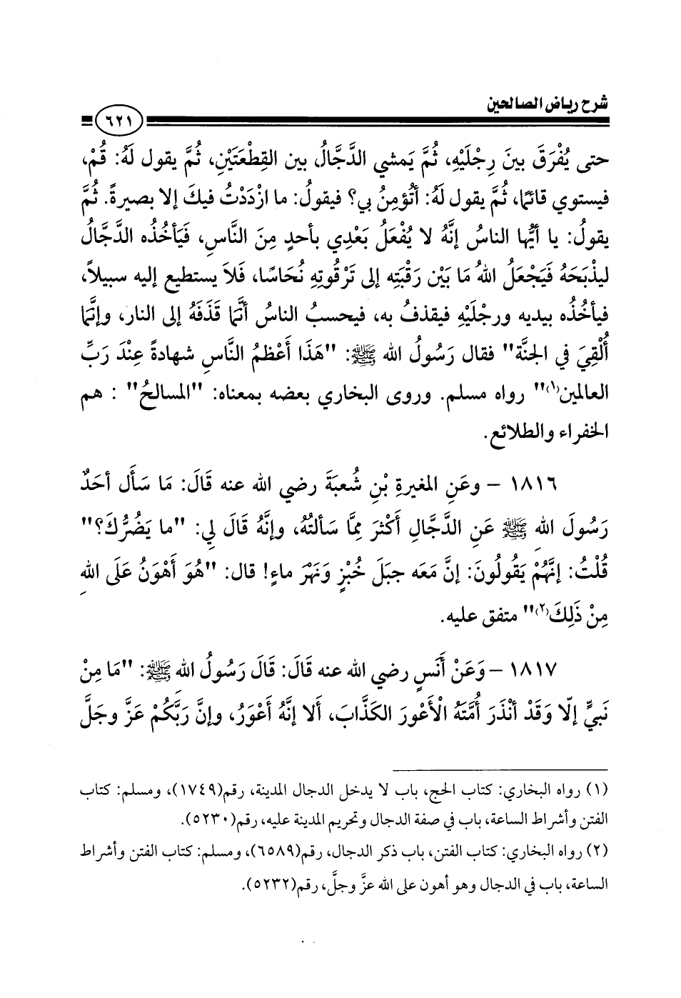 حتى يفرق بين رجليه ثم يمشي الدجال بين القطعتين ثم يقول له قم فيستوي قائما ثم يقول له أتؤمن بي فيقول ما ازددت فيك إلا بصيرة ثم يقول يا أيها الناس إنه لا يفعل بعدي بأحد من الناس فيأخذه الدجال ليذبحه فيجعل الله ما بين رقبته إلى ترقوته نحاسا فلا يستطيع إليه سبيلا فيأخذ بيديه ورجليه فيقذف به فيحسب الناس أنما قذفه إلى النار وإنما ألقي في الجنة فقال رسول الله صلى الله عليه وسلم هذا أعظم الناس شهادة عند رب العالمين رواه مسلم وروى البخاري بعضه بمعناه المسالح هم الخفراء والطلائع.
