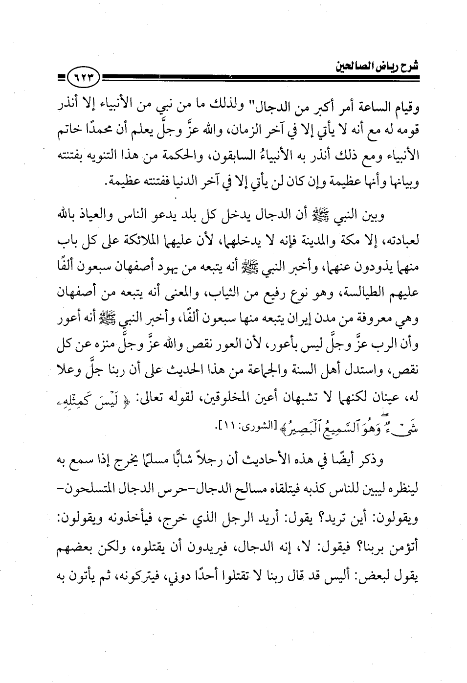 وقيام الساعة أمر أكبر من الدجال ولذلك ما من نبي من الأنبياء إلا أنذر قومه به مع أنه لا يأتي إلا في آخر الزمان والله عز وجل يعلم أن محمدا خاتم الأنبياء ومع ذلك أنذر به الأنبياء السابقون والحكمة من هذا التنويه بفتنته وبيانها وأنها عظيمة وإن كان لن يأتي إلا في آخر الدنيا ففتنته عظيمة وبين النبي صلى الله عليه وسلم أن الدجال يدخل كل بلد يدعو الناس والعياذ بالله لعبادته إلا مكة والمدينة فإنه لا يدخلهما لأن عليهما الملائكة على كل باب منهما يذودون عنهما عن مكة والمدينة وأخبر النبي صلى الله عليه وسلم أنه يتبعه من يهود أصفهان سبعون ألفا عليهم الطيالسة وهو نوع رفيع من الثياب المعنى أنه يتبعه من أصفهان وهي معروفة من مدن إيران يتبعه منها سبعون ألفا وأخبر النبي صلى الله عليه وسلم أنه أعور وأن الرب عز وجل ليس بأعور لأن العور نقص والله عز وجل منزه عن كل نقص واستدل أهل السنة والجماعة من هذا الحديث على أن ربنا جل وعلا له عينان لكنهما لا تشبهان أعين المخلوقين لقوله تعالى ليس كمثله شيء وهو السميع البصير وذكر أيضا في هذه الأحاديث أن رجلا شابا مسلما يخرج إذا سمع به ليبين للناس كذبه فيتلقاه حرس الدجال المتسلحون ويقولون أين تريد يقول أريد هذا الرجل الذي خرج فيأخذونه ويقولون أتؤمن بربنا فيقول لا إنه الدجال فيريدون أن يقتلوه ولكن بعضهم يقول لبعض أليس قد قال ربنا لا تقتلوا أحدا دوني فيتركونه ثم يأتون به