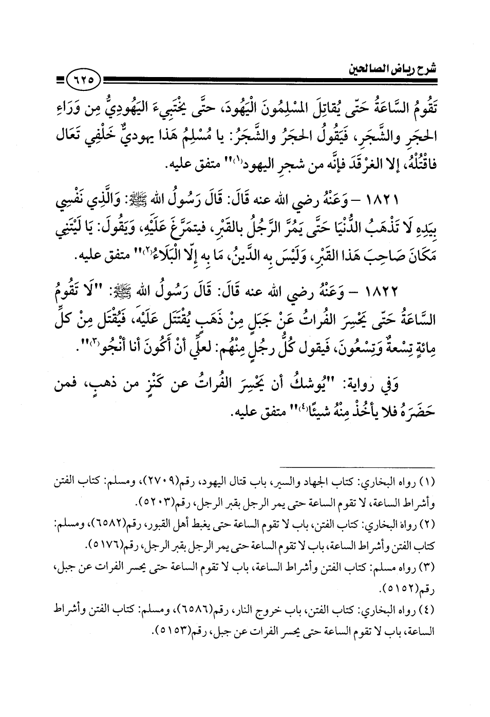 1822 - وعنه رضي الله عنه قال: قال رسول الله صلى الله عليه وسلم لا تقوم الساعة حتى يحسر الفرات عن جبل من ذهب يقتتل عليه فيقتل من كل مائة تسعة وتسعون فيقول كل رجل منهم لعلي أن أكون أنا أنجو وفي رواية يوشك أن يحسر الفرات عن كنز من ذهب فمن حضره فلا يأخذ منه شيئا متفق عليه