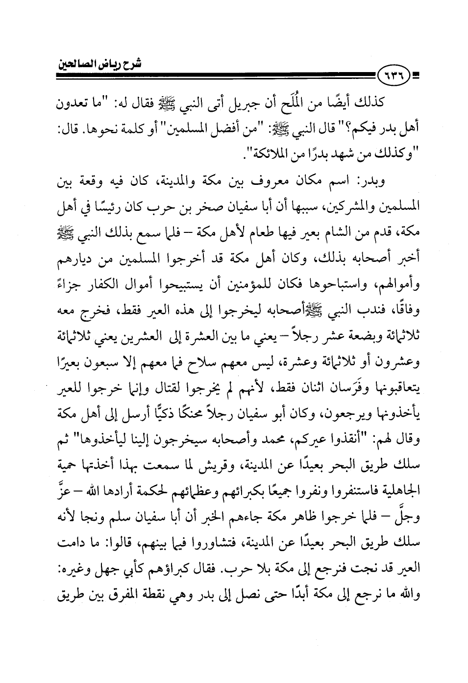 كذلك أيضا من الملح أن جبريل أتى النبي صلى الله عليه وسلم فقال له ما تعدون أهل بدر فيكم قال النبي صلى الله عليه وسلم من أفضل المسلمين أو كلمة نحوها قال وكذلك الملائكة الذين قاتلوا في بدر بدر اسم مكان بين مكة والمدينة معروف كان فيه وقعة بين المسلمين والمشركين سببها أن أبا سفيان صخر بن حرب كان رئيسا في أهل مكة وكان قدم من الشام بميرة عير فيها طعام لأهل مكة فلما سمع بذلك النبي صلى الله عليه وسلم أنه قادم إلى مكة أخبر أصحابه بذلك وكان أهل مكة قد أخرجوا المسلمين من ديارهم وأموالهم واستباحوها فكان للمؤمنين أن يستبيحوا أموال الكفار جزاء وفاقا فأخبر النبي صلى الله عليه وسلم أصحابه ليخرجوا إلى هذه العير فقط فخرج معه ثلاثمائة وبضعة عشر رجلا يعني ما بين العشرة إلى العشرين يعني مائة وعشرون أو ثلاثمائة وعشرون ليس معهم سلاح ما معهم إلا سبعون بعيرا يتعاقبونها وفرسان فقط لأنهم لم يخرجوا لقتال وإنهم خرجوا للعير يأخذونها ويرجعون أبو سفيان كان رجلا محنكا ذكيا أرسل إلى أهل مكة وقال لهم أنقذوا عيركم محمد وأصحابه سيخرجون إلينا ليأخذوها ثم سلك طريق البحر بعيدا عن المدينة وقريش لما سمعت بهذا أخذتها حمية الجاهلية فاستنفروا ونفروا جميعا بكبرائهم وعظمائهم لحكمة أرادها الله عز وجل فلما خرجوا ظاهر مكة جاءهم الخبر أن أبا سفيان سلم ونجا لأنه سلك طريق البحر بعيدا عن المدينة ولم يدركه الرسول وأصحابه فتشاوروا فيما بينهم قالوا مادامت العير نجت فنرجع إلى مكة وما لنا والحروب فقال كبراؤهم كأبي جهل وغيره والله ما نرجع إلى مكة أبدا حتى نصل إلى بدر وهي نقطة المفرق بين