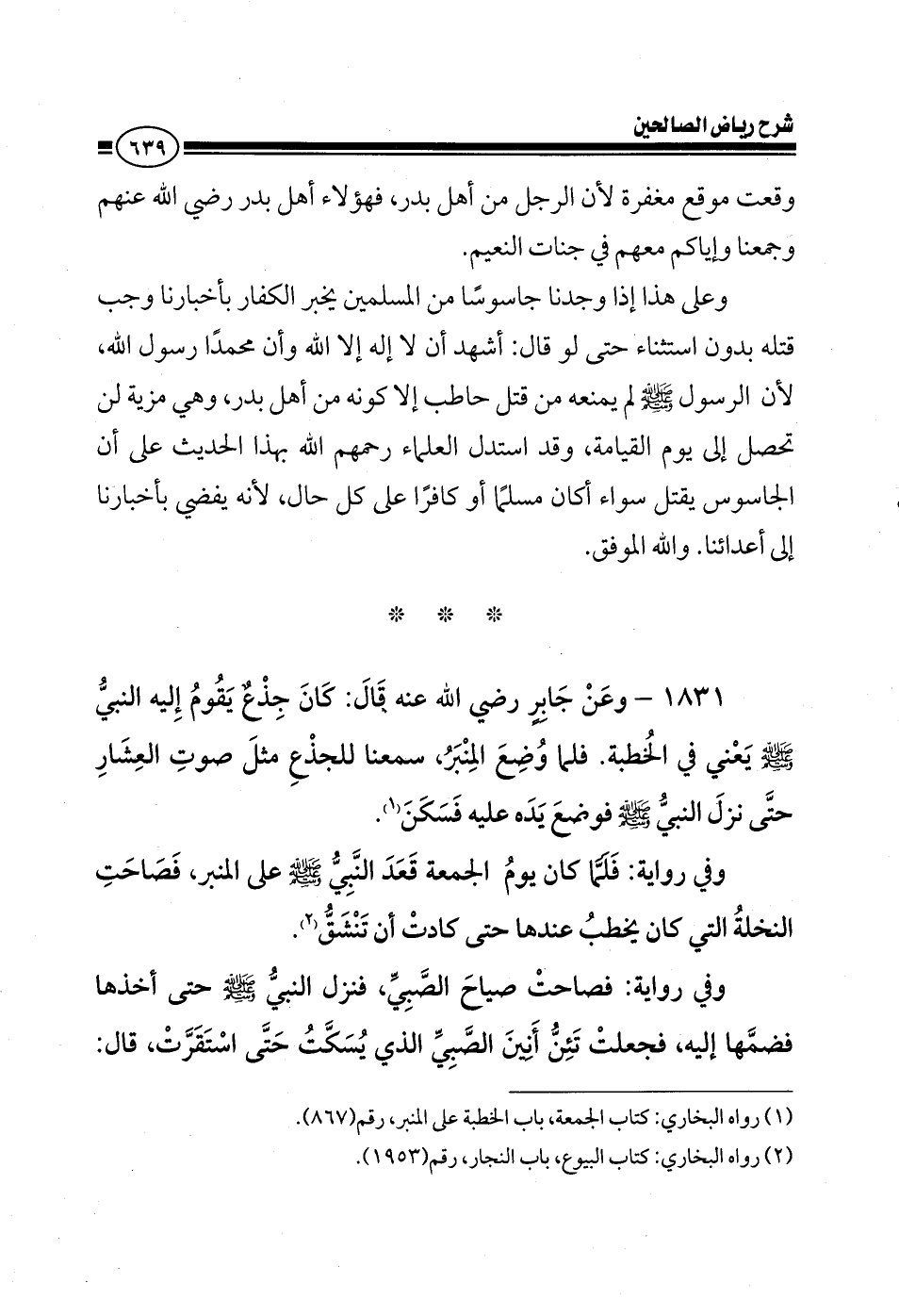1831 - وعن جابر رضي الله عنه قال: كان جذع يقوم إليه النبي صلى الله عليه وسلم يعني في الخطبة فلما وضع المنبر سمعنا للجذع مثل صوت العشار حتى نزل النبي صلى الله عليه وسلم فوضع يده عليه فسكن وفي رواية: فلما كان يوم الجمعة قعد النبي صلى الله عليه وسلم على المنبر فصاحت النخلة التي كان يخطب عندها حتى كادت أن تنشق وفي رواية: فصاحت صياح الصبي فنزل النبي صلى الله عليه وسلم حتى أخذها فضمها إليه فجعلت تئن أنين الصبي الذي يسكت حتى استقرت قال