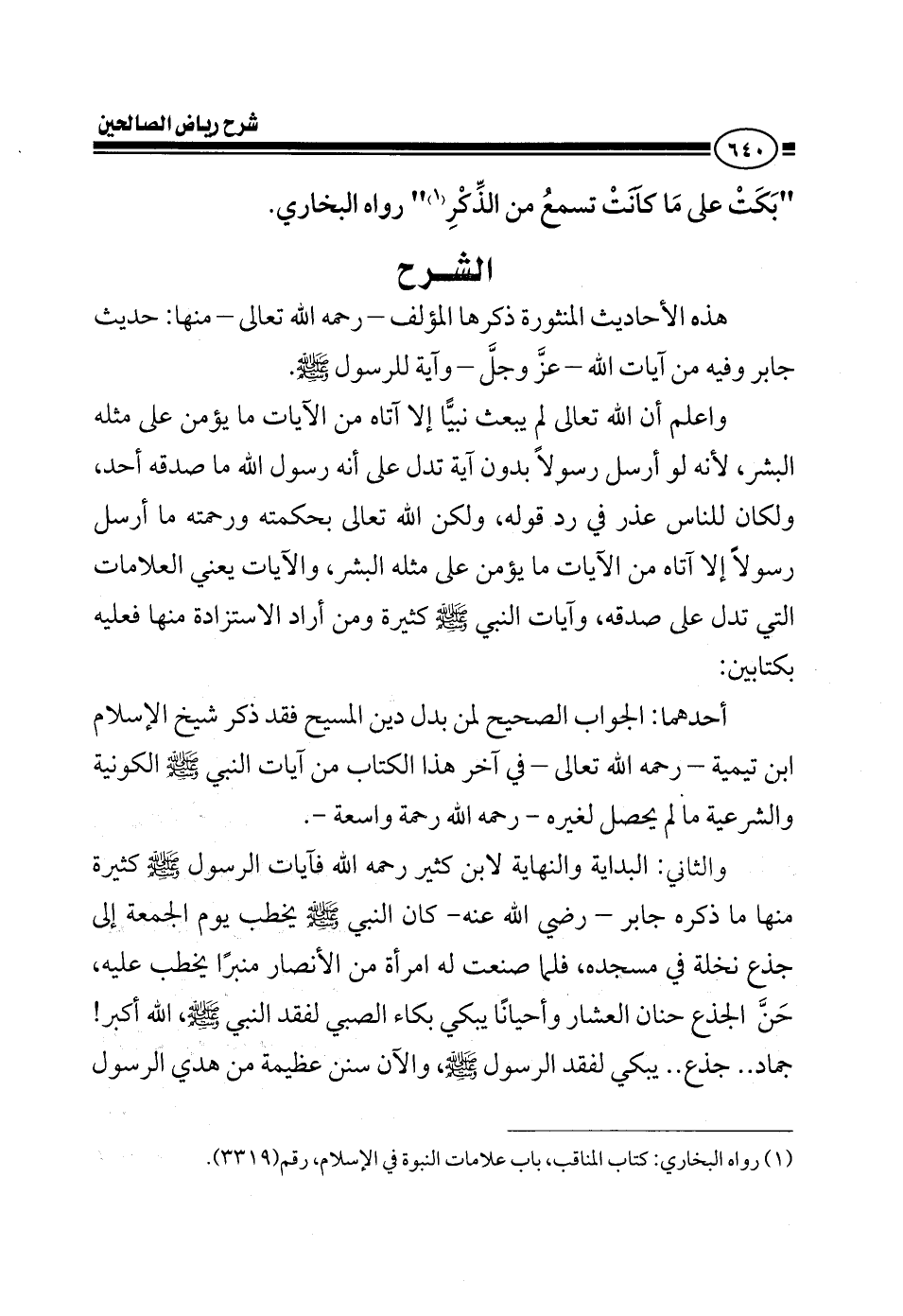 EXهذه الأحاديث المنثورة التي ذكرها المؤلف رحمه الله في آخر كتابه رياض الصالحين حديث جابر وفيه آية من آيات الله عز وجل وآية لرسوله صلى الله عليه وسلم واعلم أن الله تعالى لم يبعث نبيا إلا آتاه من الآيات ما يؤمن على مثله البشر لأنه لو أرسل رسولا بدون آية تدل على أنه رسول الله ما صدقه أحد ولكان للناس عذر في رد قوله ولكن الله تعالى بحكمته ورحمته ما أرسل رسولا إلا آتاه من الآيات ما يؤمن على مثله البشر الآيات يعني العلامات التي تدل على صدقه وآيات النبي صلى الله عليه وسلم كثيرة ومن أراد الاستزادة منها فعليه بكتابين أحدهما الجواب الصحيح لمن بدل دين المسيح فقد ذكر رحمه الله شيخ الإسلام في هذا الكتاب في آخره من آيات النبي صلى الله عليه وسلم الكونية والشرعية ما لم يحصل لغيره رحمه الله رحمة واسعة والثاني البداية والنهاية لابن كثير رحمه الله فآيات الرسول صلى الله عليه وسلم كثيرة منها ما ذكره جابر كان النبي صلى الله عليه وسلم يخطب يوم الجمعة إلى جزع نخلة فلما صنعت له امرأة من الأنصار منبرا يخطب عليه فإذا بالجزع يحن حنان العشار وأحيانا يبكي بكاء الصبي لفقد النبي صلى الله عليه وسلم الله أكبر جماد..