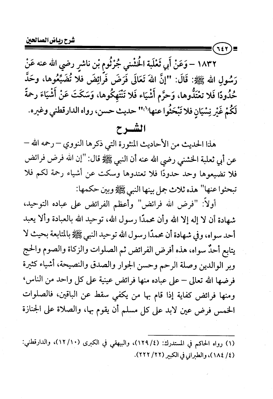 1832 - وعن أبي ثعلبة الخشني جرثوم بن ناشر رضي الله عنه عن رسول الله صلى الله عليه وسلم قال إن الله تعالى فرض فرائض فلا تضيعوها وحد حدودا فلا تعتدوها وحرم أشياء فلا تنتهكوها وسكت عن أشياء رحمة لكم غير نسيان فلا تبحثوا عنها حديث حسن رواه الدارقطني وغيره