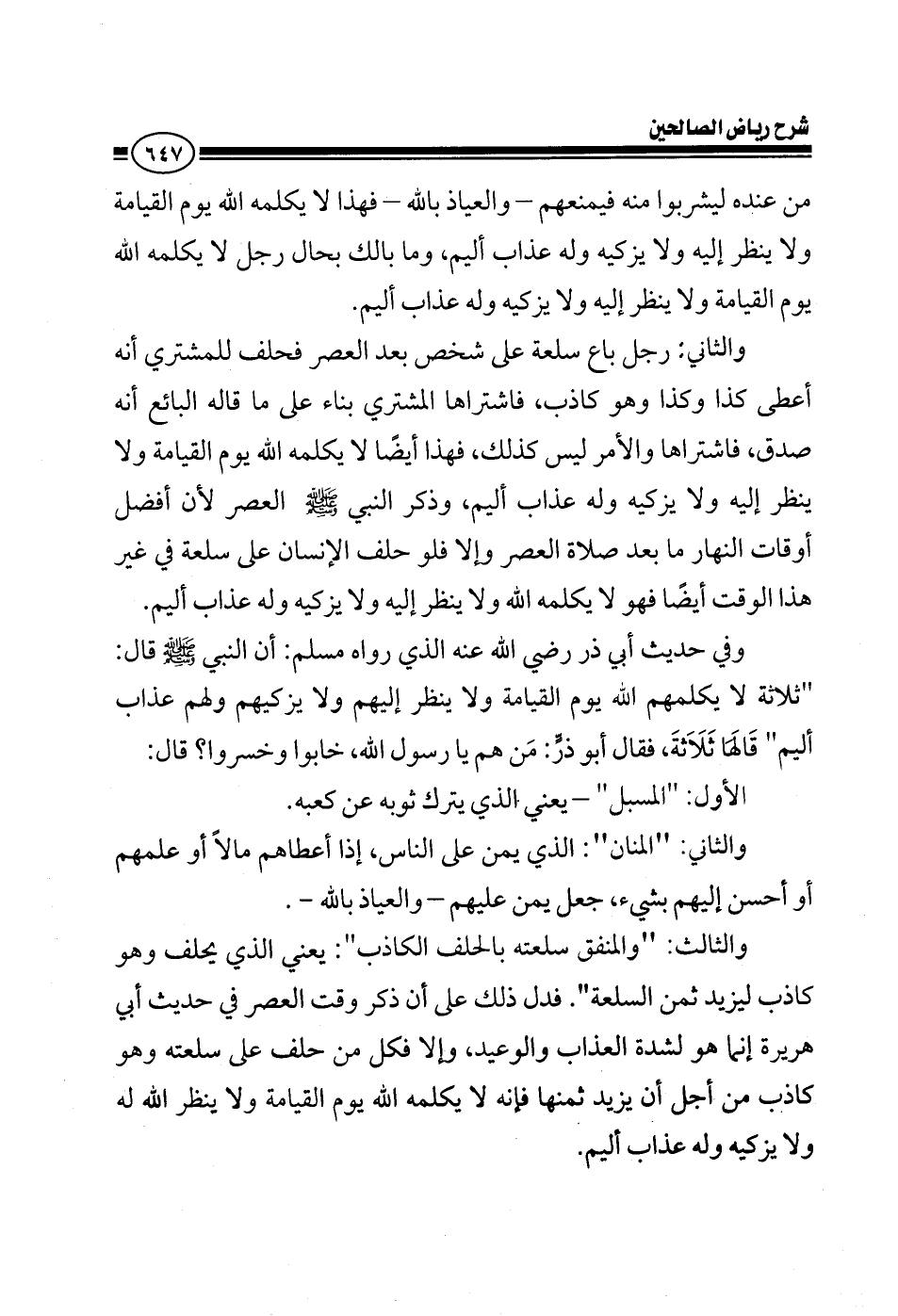 من عنده ليشربوا فيمنعهم والعياذ بالله هذا لا يكلمه الله يوم القيامة ولا ينظر إليه ولا يزكيه وله عذاب أليم وما بالك بحال رجل هذا حاله لا يكلمه الله يوم القيامة ولا ينظر إليه ولا يزكيه وله عذاب أليم يوم القيامة والثاني رجل باع سلعة بعد العصر فحلف للمشتري أنه أعطى كذا وكذا وهو كاذب فاشتراها المشتري بناء على ما قاله البائع أنه صدق والأمر ليس كذلك فهذا أيضا لا يكلمه الله يوم القيامة ولا ينظر إليه ولا يزكيه وله عذاب أليم وذكر النبي صلى الله عليه وسلم العصر لأن أفضل أوقات النهار ما بعد صلاة العصر وإلا فلو حلف الإنسان على سلعة في غير هذا الوقت أيضا فإنه لا يكلمه الله ولا ينظر إليه ولا يزكيه وله عذاب أليم ففي حديث أبي ذر الذي رواه مسلم أن النبي صلى الله عليه وسلم قال ثلاثة لا يكلمهم الله يوم القيامة ولا ينظر إليهم ولا يزكيهم ولهم عذاب أليم قالها ثلاثا فقال أبو ذر من هم يا رسول الله خابوا وخسروا قال المسبل يعني الذي يسبل ثوبه ينزله على الكعب حتى يجره على الأرض والثاني المنان الذي يمن على الناس إذا أعطاهم مالا أو علمهم أو أحسن إليهم بشيء جعل يمن عليهم والعياذ بالله والثالث المنفق سلعته بالحلف الكاذب يعني الذي يحلف وهو كاذب ليزيد ثمن السلعة فدل ذلك على أن ذكر وقت العصر في حديث أبي هريرة إنما هو لشدة العذاب والوعيد وإلا فكل من حلف على سلعة وهو كاذب من أجل أن يزيد ثمنها فإنه لا يكلمه الله ولا ينظر إليه ولا يزكيه وله عذاب أليم
