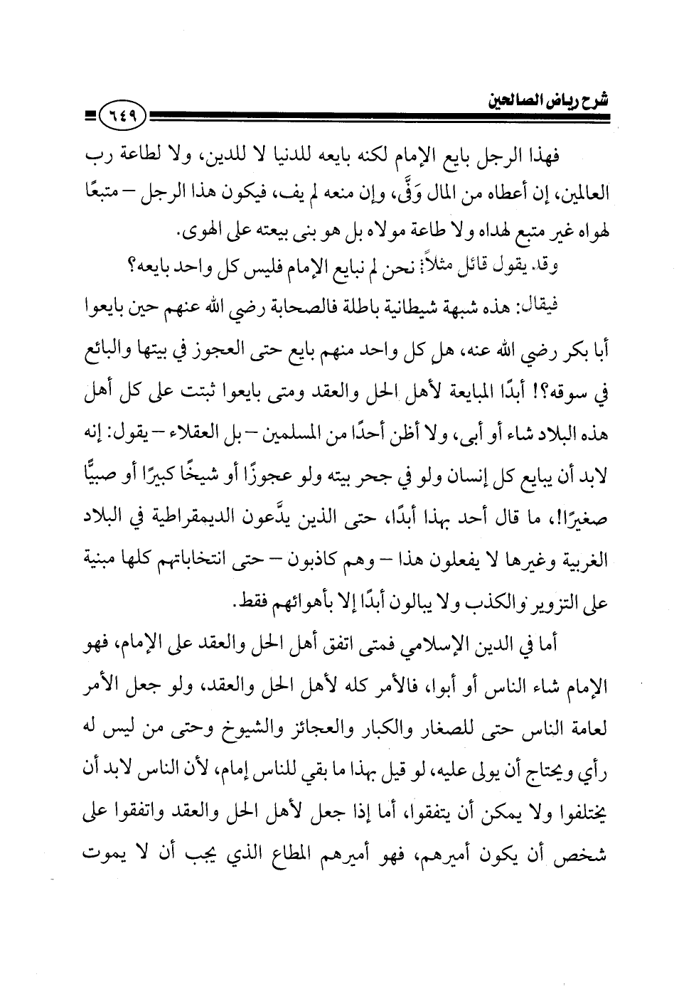 فهذا الرجل بايع الإمام لكنه بايعه للدنيا لا للدين ولا لطاعة رب العالمين إن أعطاه من المال وفى وإن منعه لم يف فيكون هذا الرجل والعياذ بالله متبعا لهواه غير متبع لهداه ولا طاعة مولاه بل هو بنى بيعته على الهوى قد يقول قائل مثلا نحن لم نبايع الإمام فليس كل واحد بايعه فيقال هذه شبهة شيطانية باطلة هل الصحابة رضي الله عنهم حين بايعوا أبا بكر هل كل واحد منهم بايع حتى العجوز في بيتها واليافع في سوقه أبدا المبايعة لأهل الحل والعقد ومتى بايعوا ثبتت الولاية على كل أهل هذه البلاد شاء أم أبى ولا أظن أحدا من المسلمين بل ولا من العقلاء يقول إنه لابد أن يبايع كل إنسان ولو في جحر بيته ولو عجوزا أو شيخا كبيرا أو صبيا صغيرا ما قال أحد بهذا حتى الذين يدعون الديمقراطية في البلاد الغربية وغيرها لا يفعلون هذا وهم كاذبون حتى انتخاباتهم كلها مبنية على التزوير والكذب ولا يبالون أبدا إلا بأهوائهم فقط الدين الإسلامي متى اتفق أهل الحل والعقد على مبايعة الإمام فهو الإمام شاء الناس أم أبوا فالأمر كله لأهل الحل والعقد ولو جعل الأمر لعامة الناس حتى للصغار والكبار والعجائز والشيوخ وحتى من ليس له رأي ويحتاج أن يولى عليه ما بقى للناس إمام لأنهم لابد أن يختلفوا