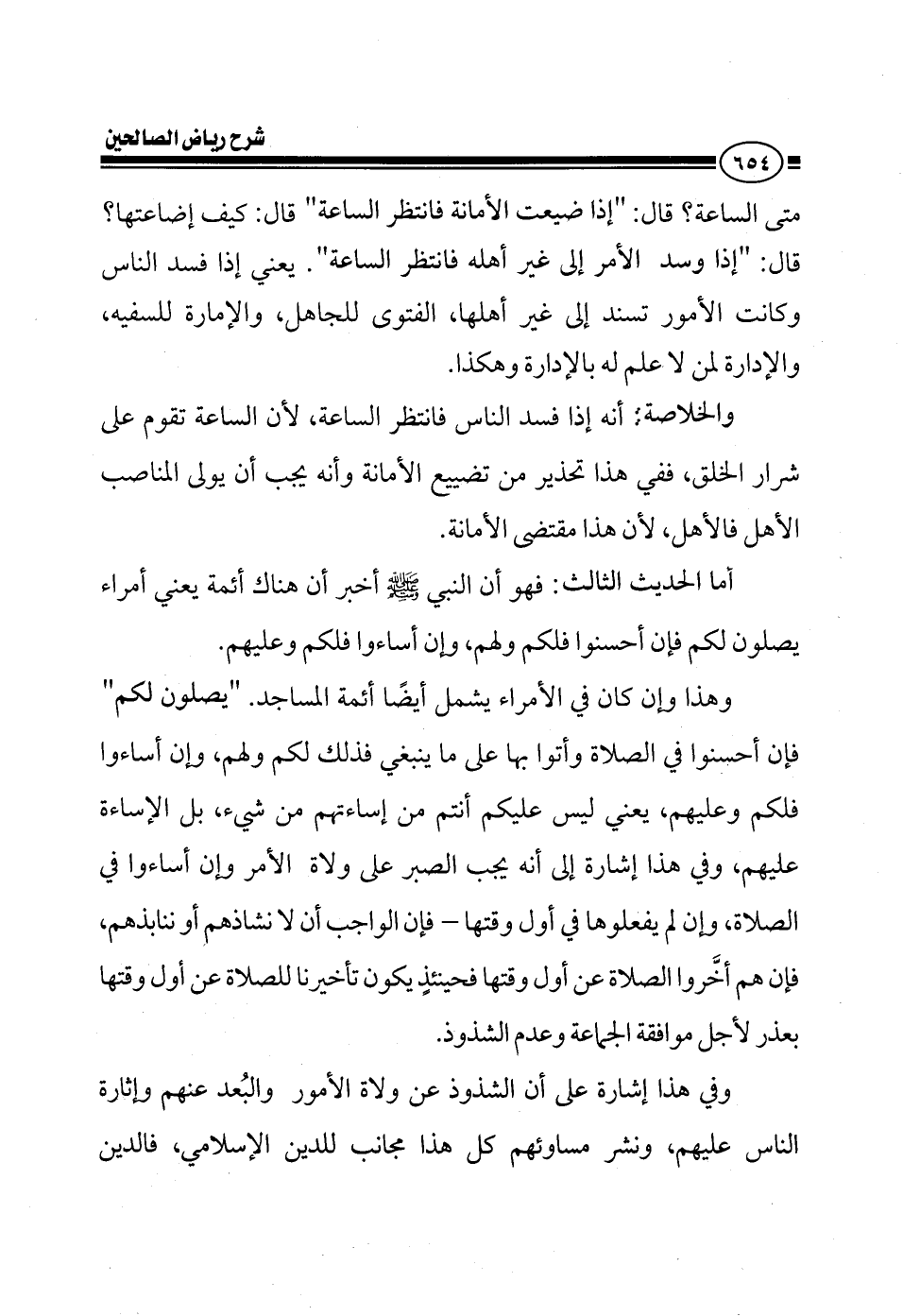وهكذا والخلاصة أنه إذا فسد الناس فانتظر الساعة لأن الساعة تقوم على شرار الخلق ففي هذا التحذير من تضييع الأمانة وأنه يجب أن يولي المناصب الأهل فالأهل لأن هذا مقتضى الأمانة أما الحديث الثالث فهو أن النبي صلى الله عليه وسلم أخبر أن هناك أئمة يعني أمراء يصلون لكم فإن أحسنوا فلكم ولهم وإن أساءوا فلكم وعليهم وهذا وإن كان في الأمراء يشمل أيضا أئمة المساجد يصلون لكم فإن أحسنوا في الصلاة وأتوا بها على ما ينبغي فذلك لكم ولهم وإن أساءوا فلكم وعليهم يعني ليس عليكم أنتم من إساءتهم من شيء وفي هذا إشارة إلى أنه يجب الصبر على ولاة الأمر وإن أساءوا في الصلاة وإن لم يصلوها على وقتها فإن الواجب ألا نشذ عنهم وأن نؤخر الصلاة كما يؤخرون وحينئذ يكون تأخيرنا للصلاة عن أول وقتها يكون تأخيرا بعذر لأجل موافقة الجماعة وعدم الشذوذ ويكون بالنسبة لنا كأننا صلينا في أول الوقت وفي هذا إشارة إلى أن الشذوذ عن الناس وعن ولاة الأمور والبعد عنهم وإثارة الناس عليهم ونشر مساوئهم كل هذا مجانب للدين الإسلامي فالدين