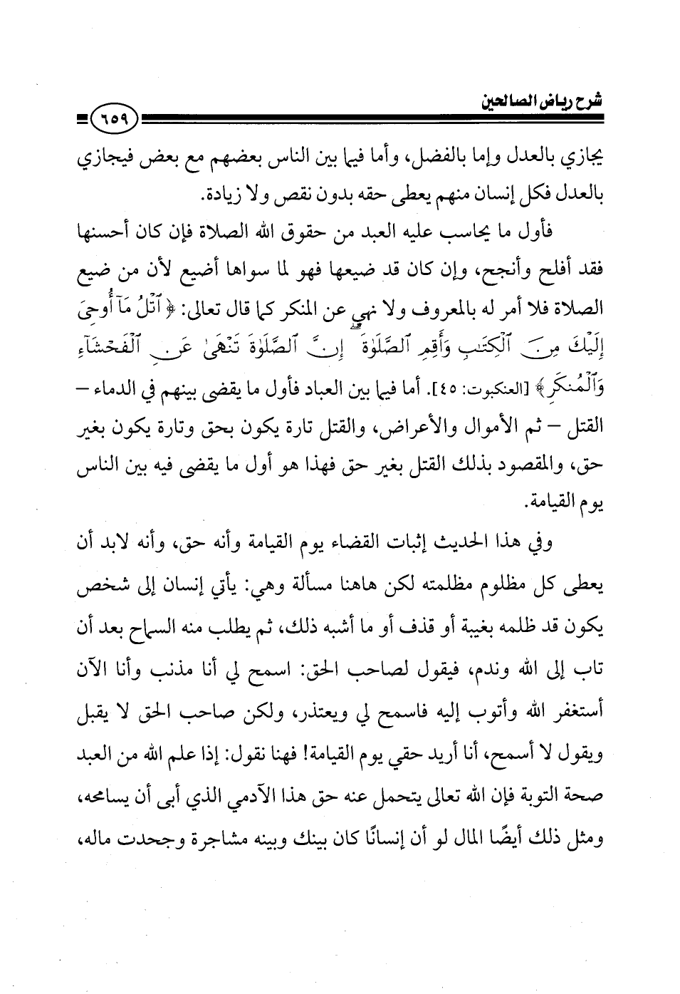 يجازي بالعدل وإما بالفضل وأما فيما بين الناس بعضهم مع بعض فيجازي بالعدل فكل إنسان منهم يعطى حقه بدون نقص ولا زيادة فأول ما يحاسب عليه العبد من حقوق الله الصلاة فإن كان أحسنها فقد أفلح وأنجح وإن كان قد ضيعها فهو لما سواها أضيع لأن من ضيع الصلاة فلا آمر له بالمعروف ولا ناهي له عن المنكر كما قال تعالى اتل ما أوحي إليك من الكتاب وأقم الصلاة إن الصلاة تنهى عن الفحشاء والمنكر أما فيما بين العباد فأول ما يقضي بينهم في الدماء القتل ثم الأموال والأعراض والقتل تارة يكون بحق وتارة يكون بغير حق والمقصود بذلك القتل بغير حق فهذا هو أول ما يقض فيه بين الناس يوم القيامة وفي هذا الحديث إثبات القضاء يوم القيامة وأنه حق وأنه لابد أن يعطي كل مظلوم مظلمته لكن هاهنا مسألة وهي يأتي إنسان إلى شخص يكون قد ظلمه بغيبة أو قذف أو ما أشبه ذلك ثم يطلب منه السماح بعد أن تاب إلى الله وندم فيقول لصاحب الحق اسمح لي أنا مذنب وأنا الآن أستغفر الله وأتوب إليه فاسمح لي ويعتذر ولكن صاحب الحق لا يقبل فهنا نقول إذا علم الله من العبد صحة التوبة فإن الله تعالى يتحمل عنه حق هذا الآدمي الذي أبى أن يسامحه ومثل ذلك أيضا المال لو أن إنسانا كان بينك وبينه مشاجرة وجحدت ماله