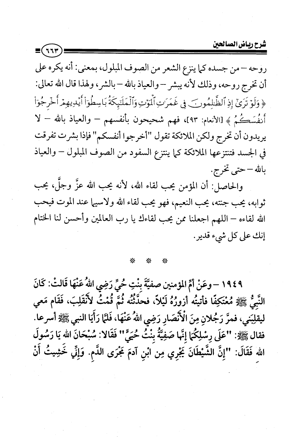 1849 - وعن أم المؤمنين صفية بنت حيي رضي الله عنها قالت كان النبي صلى الله عليه وسلم معتكفا فأتيته أزوره ليلا فحدثته ثم قمت لأنقلب فقام معي ليقلبني فمر رجلان من الأنصار رضي الله عنهما فلما رأيا النبي صلى الله عليه وسلم أسرعا فقال صلى الله عليه وسلم على رسلكما إنها صفية بنت حيي فقالا سبحان الله يا رسول الله فقال إن الشيطان يجري من ابن آدم مجرى الدم وإني خشيت أن