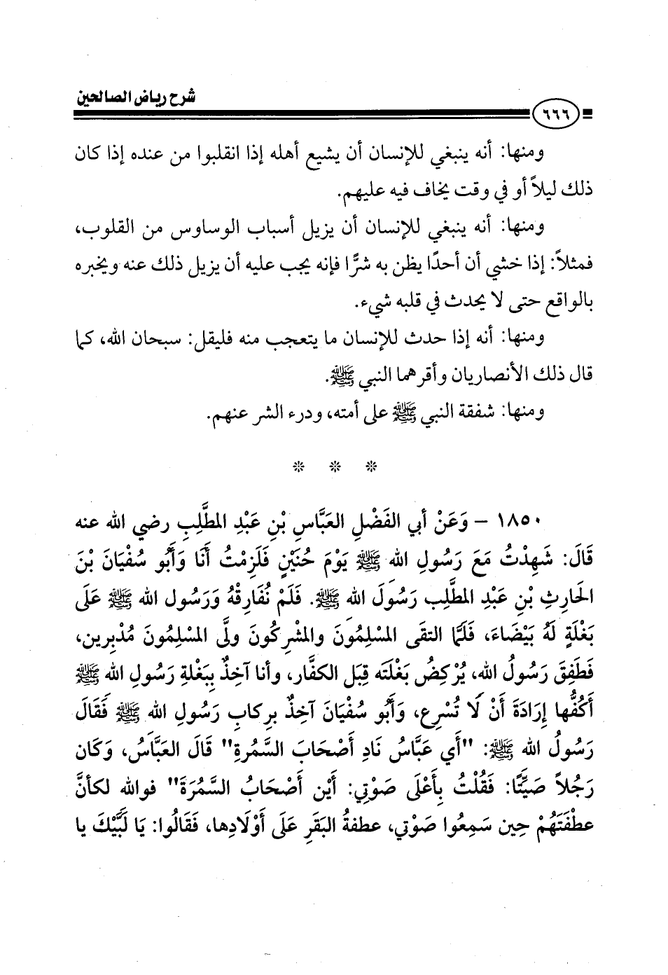 1850 - وعن أبي الفضل العباس بن عبد المطلب رضي الله عنه قال شهدت مع رسول الله صلى الله عليه وسلم يوم حنين فلزمت أنا وأبو سفيان بن الحارث بن عبد المطلب رسول الله صلى الله عليه وسلم لم نفارقه ورسول الله صلى الله عليه وسلم على بغلة له بيضاء فلما التقى المسلمون والمشركون ولى المسلمون مدبرين فطفق رسول الله صلى الله عليه وسلم يركض بغلته قبل الكفار وأنا آخذ بلجام بغلة رسول الله صلى الله عليه وسلم أكفها إرادة أن لا تسرع وأبو سفيان آخذ بركاب رسول الله صلى الله عليه وسلم فقال رسول الله صلى الله عليه وسلم أي عباس ناد أصحاب السمرة قال العباس وكان رجلا صيتا فقلت بأعلى صوتي أين أصحاب السمرة فوالله لكأن عطفتهم حين سمعوا صوتي عطفة البقر على أولادها فقالوا يا لبيك يا