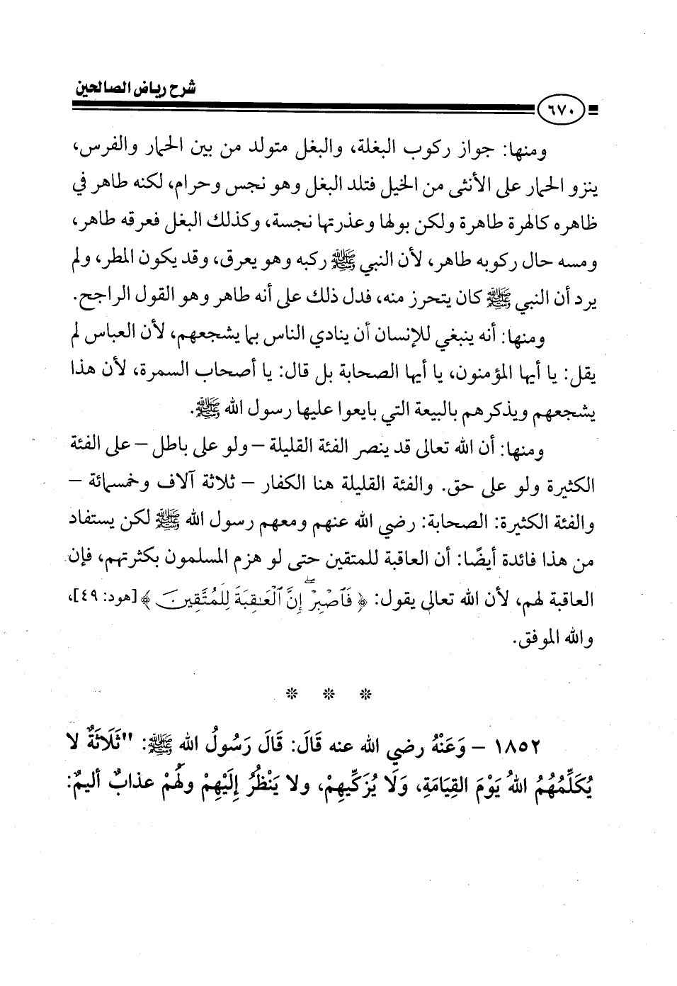 1852 - وعنه رضي الله عنه قال: قال رسول الله صلى الله عليه وسلم ثلاثة لا يكلمهم الله يوم القيامة ولا يزكيهم ولا ينظر إليهم ولهم عذاب أليم