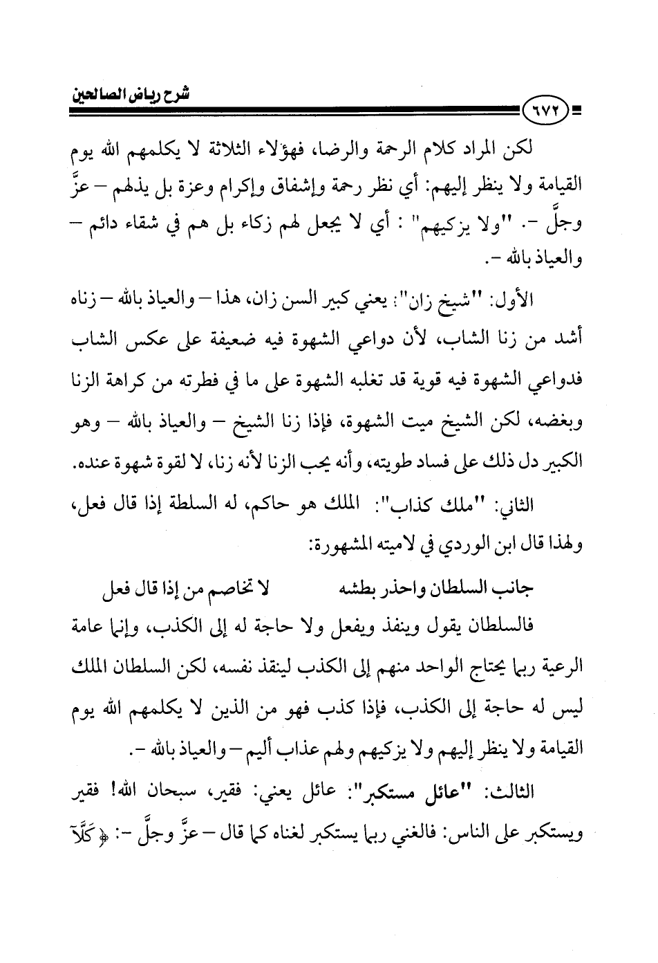 لكن المراد كلام الرحمة والرضا فهؤلاء الثلاثة لا يكلمهم الله يوم القيامة ولا ينظر إليهم أي نظر رحمة وإشفاق وإكرام وعزة بل يذلهم عز وجل ولا يزكيهم أي لا يجعل لهم زكاء بل هم في شقاء دائم والعياذ بالله الأول شيخ زان يعني كبير السن زان هذا والعياذ بالله زناه أشد من زنا الشاب لأن دواعي الشهوة فيه قليلة على عكس الشاب فدواعي الشهوة فيه قوية قد تغلبه على ما في قلبه من كراهة الزنا وبغضه لكن الشيخ ميت الشهوة فإذا زنا الشيخ والعياذ بالله وهو الكبير دل ذلك على فساد طويته وأنه يحب الزنا لأنه زنا لا لقوة شهوة عنده الثاني ملك كذاب الملك هو حاكم له السلطة إذا قال فعل ولهذا قال ابن المواردي في لاميته المشهورة