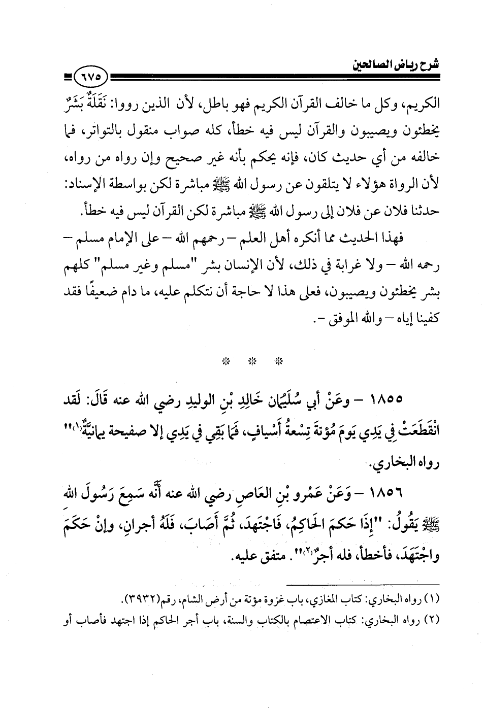 1856 - وعن عمرو بن العاص رضي الله عنه أنه سمع رسول الله صلى الله عليه وسلم يقول: إذا حكم الحاكم فاجتهد ثم أصاب فله أجران وإذا حكم واجتهد فأخطأ فله أجر متفق عليه