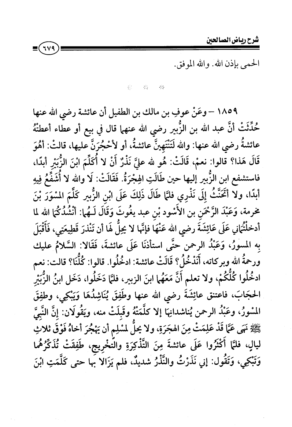 1859 - وعن عوف بن مالك بن الطفيل أن عائشة رضي الله عنها حدثت أن عبد الله بن الزبير رضي الله عنهما قال في بيع أو عطاء أعطته عائشة رضي الله تعالى عنها والله لتنتهين عائشة أو لأحجرن عليها قالت أهو قال هذا قالوا نعم قالت هو لله علي نذر أن لا أكلم ابن الزبير أبدا فاستشفع ابن الزبير إليها حين طالت الهجرة فقالت لا والله لا أشفع فيه أبدا ولا أتحنث إلى نذري فلما طال ذلك على ابن الزبير كلم المسور بن محزمة وعبد الرحمن بن الأسود بن عبد يغوث وقال لهما أنشدكما الله لما أدخلتماني على عائشة رضي الله عنها فإنها لا يحل لها أن تنذر قطيعتي فأقبل به المسور وعبد الرحمن حتى استأذنا على عائشة فقالا السلام عليك ورحمة الله وبركاته أندخل قالت عائشة ادخلوا قالوا كلنا قالت نعم ادخلوا كلكم ولا تعلم أن معهما ابن الزبير فلما دخلوا دخل ابن الزبير الحجاب فاعتنق عائشة رضي الله عنها وطفق يناشدها ويبكي وطفق المسور وعبد الرحمن يناشدانها إلا كلمته وقبلت منه ويقولان إن النبي صلى الله عليه وسلم نهى عما قد علمت من الهجرة ولا يحل لمسلم أن يهجر أخاه فوق ثلاث ليال فلما أكثروا على عائشة من التذكرة والتحريج طفقت تذكرهما وتبكي وتقول إني نذرت والنذر شديد فلم يزالا بها حتى كلمت ابن