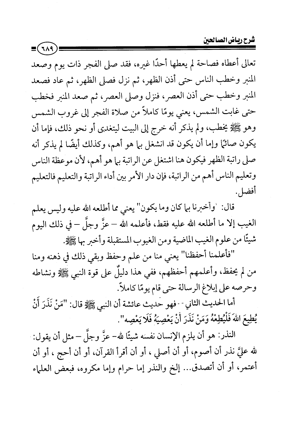 تعالى أعطاه قوة لم يعطها أحدا غيره فقد صلى الفجر صلى الله عليه وسلم ذات يوم وصعد المنبر وخطب الناس حتى أذن الظهر ثم نزل فصلى الظهر ثم عاد فصعد المنبر وخطب حتى أذن العصر فنزل وصلى العصر ثم صعد المنبر فخطب حتى غابت الشمس يعني يوما كاملا من صلاة الفجر إلى غروب الشمس وهو صلى الله عليه وسلم يخطب ولم يذكر أنه خرج إلى البيت ليتغدى أو نحو ذلك فإما أن يكون صائما وإما أن يكون قد انشغل بما هو أهم وكذلك أيضا لم يذكر أنه صلى راتبة الظهر فيكون هنا اشتغل عن الراتبة بما هو أهم لأن موعظة الناس وتعليم الناس أهم من الراتبة فإن دار الأمر بين أداء الراتبة والتعليم فالتعليم أفضل قال وأخبرنا بما كان وما يكون يعني مما أطلعه الله عليه وليس يعلم الغيب إلا من أطلعه الله عليه فقط فأعلمه الله عز وجل في ذلك اليوم شيئا من علوم الغيب الماضية ومن الغيوب المستقبلة وأخبر بها صلى الله عليه وسلم فأعلمنا أحفظنا يعني منا من علم وحفظ وبقى ذلك في ذهنه ومنا من لم يحفظ ففي هذا دليل على قوة النبي صلى الله عليه وسلم ونشاطه وحرصه على إبلاغ الرسالة حتى قام يوما كاملا وأما الحديث الثاني فهو حديث عائشة أن النبي صلى الله عليه وسلم قال من نذر أن يطيع الله فليطعه ومن نذر أن يعصيه فلا يعصه النذر هو أن يلزم الإنسان نفسه شيئا لله عز وجل مثل أن يقول لله علي نذر أن أقوم أن أصوم أن أصلي أن أقرأ القرآن أن أتصدق..