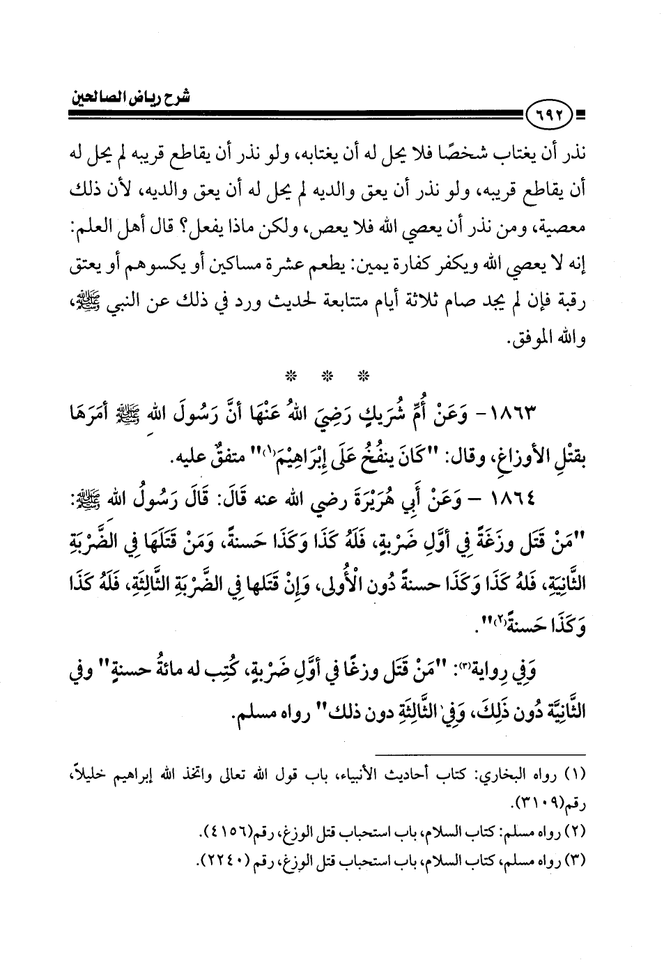 1864 - وعن أبي هريرة رضي الله عنه قال: قال رسول الله صلى الله عليه وسلم: من قتل وزغة في أول ضربة فله كذا وكذا حسنة ومن قتلها في الضربة الثانية فله كذا وكذا حسنة دون الأولى وإن قتلها في الضربة الثالثة فله كذا وكذا حسنة وفي رواية من قتل وزغا في أول ضربة كتب له مائة حسنة وفي الثانية دون ذلك وفي الثالثة دون ذلك رواه مسلم