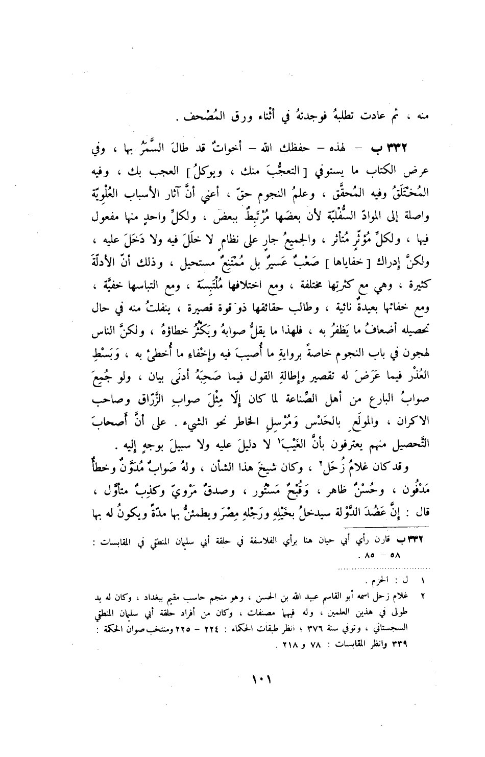 - لهذه - حفظك الله - أخوات قد طال السمر بها، وفي عرض الكتاب ما يستوفي التعجب منك، ويوكل العجب بك، وفيه المختلق وفيه المحقق، وعلم النجوم حق، أعني أن آثار الأسباب العلوية واصلة إلى المواد السفلية لأن بعضها مرتبط ببعض، ولكل واحد منها مفعول فيها، ولكل مؤثر متأثر، والجميع جار على نظامر لا خلل فيه لا دخل عليه، ولكن إدراك خفاياها صعب عسير بل ممتع مستحيل، وذلك أن الأدلة كثية، ويه مع كثرتها مختلفة، ومع اختلافها ملتبسة، مع التباسها خفية، ومع خفائها بعسدة نائية، وطالب حقائقها ذو قوة قصيرة، ينفلت منه في حال تحصيله أضعاف ما يظفر به، فلهذا ما يقل صوابه ويكثر خطاؤه، ولكن الناس لهجون في باب النجوم خاصة برواية ما أصيب فيه وإخفاء ما أخطى به، وبسط العذر فيما عرض له تقصير وإطالة القول فيما صحبه أدنى بيان، لو جمع صواب البارع من أهل الصناعة لما كان إلا مثل صواب الزراق وصاحب الإكران، والمولع بالحدس ومرسل الخاطر نحو الشيء. على أن أصحاب التحصيل منهم يعترفون بأن الغيب لا دليل عليه ولا سبيل بوجه إليه.