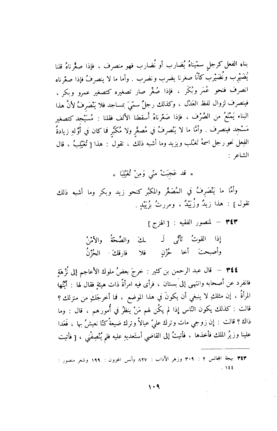 بناء الفعل كرجل سميناه يضارب أو نضارب فهو منصرف، فإذا صغرناه قلنا يضيرب ونضيرب كأنا صغرنا يضرب ونضرب ونضرب، وأما ما لا ينصرف فإذا صغرناه انصرف فنحو عمر وبكر، فإذا صغر تصغير كتصغير عمرو وبكر، فينصرف لزوال الفظ العدل، وكذلك رجل سمي بمساجد فلا ينصرف لأن هذا البناء يمنع من الصرف، فإذا صغرناه أسقطنا الألف فقلنا: مسيجد كتصغير مسجد فينصرف. وأما ما لا سنصرف في مصغر ولا مكبر فما كان في أوله زيادة الفعل نحو رجل اسمه تغلب ويزيد وما اشبه ذلك، تقول: هذا تغيلب، قال الشاعر: