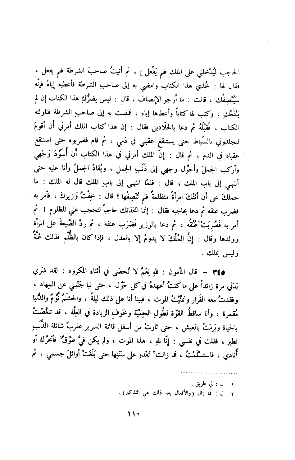 الحاجب ليدخلني على الملك فلم يفعل، ثم أتيت صاحب الشرطة فلم يفعل، فقال لها: خذي هذا الكتاب وامضي به إلى احب الشطرة فأعطيه إياه فإنه سينصفك، قالت: ما أرجو الإنصاف، قال: ليس يضرك هذا الكتاب إن لم ينفعك، وكتب لها كتاباً وأعطاها إياه، فمضت به إلى صاحب الشرطة فناولته الكتبا، فقبله ثم دعا بالجلادين فقال: إن هذا كتاب الملك أمرني أن أقوم لتجلدوني بالسياط حتى يستنقع عقبي في دمي، ثم قام فضربوه حتى استنقع عقباه في الدم، ثم قال: إن الملك أمرني في هذا الكتاب أن أسود وجهي وأركب الجمل وأحول وجهي إلى ذنب الجمل، ويقاد الجمل وأنا عليه حتى أنتهي إلى باب الملك؛ قال: فلما انتهى إلى باب الملك قال له الملك: ما حملك على أن أتتك امرأة متظلمة فلم تنصفها؟ قال: خفت وزيرك، فأمر به فضرب عنقه ثم دعا بحاجبه فقال: إنما اتخذتك حاجباً لتحجب عني المظلوم! ثم أمر به فضرب عنقه، ثم دعا بالوزير فضرب عنقه، ثم رد الضيعة على المرأة وولدها وقال: إن الملك لا يدوم إلا بالعدل، فإذا كان بالظلم فذلك غلة وليس بملك.