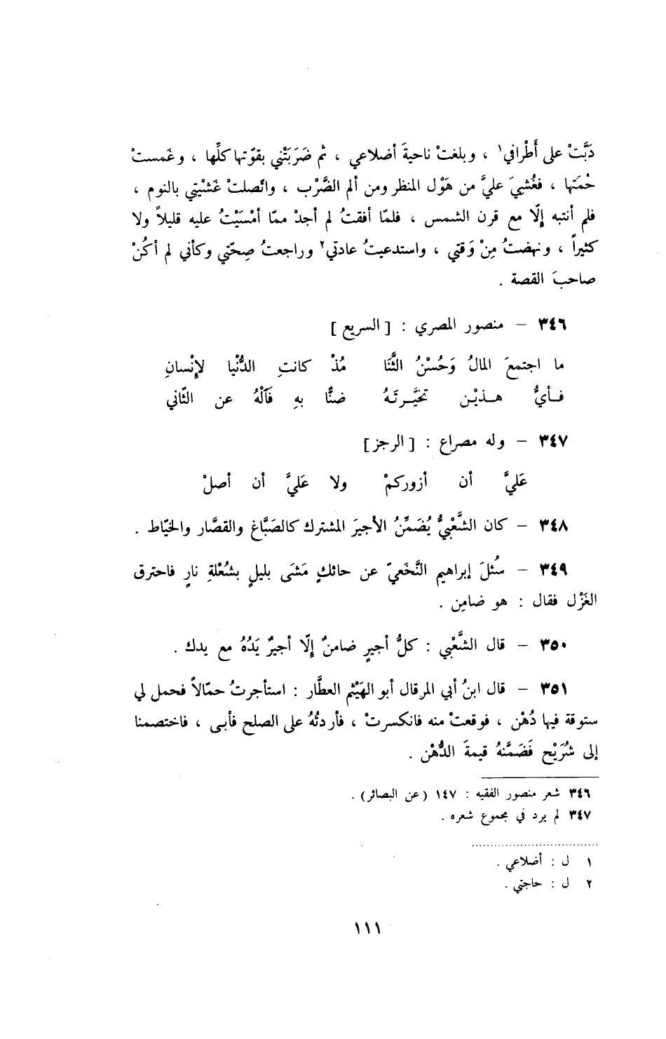 دبت على أطرافي، وبلغت ناحية أضلاعي، ثم ضربتيني بقوتها كلها، وغمست حمتها، فغشي علي من هول المنظر ومن ألم الضرب، واتصلت عشيتي بالنوم، فلم أنتبه إلا مع قرن الشمس، فلما أفقت لم أجد مما أمسيت عليه قليلاً ولا كثيراً، ونهضت من وقتي، واستعديت عادتي وراجعت صحتي وكأني لم أكن صاحب القصة.