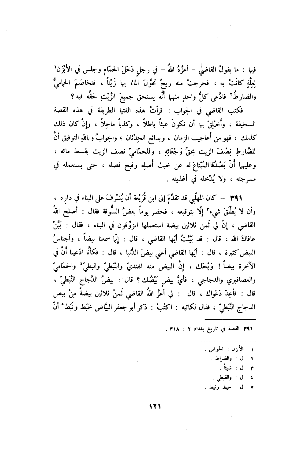 فكتب القاضي في الجواب: قرأت هذه الفتيا الطريفة في هذه القصة السخيفة، وأخلق بها أن تكون عبثاً باطلاً، وكذبا ماحلاً، وإن كان ذلك كذلك، فهو من أعاجيب الزمان، وبدائع الحدثان؛ والجواب وبالله التوفيق أن للضارط نصف الزيت بحق وجعئه، وللحمامي نصف الزيت بقسط مائه، وعليهما أن يصدقا المبتاع له عن خبث أصله وقبح فصله، حتى يستعمله في مسرجته، ولايدخله في أغذيته.