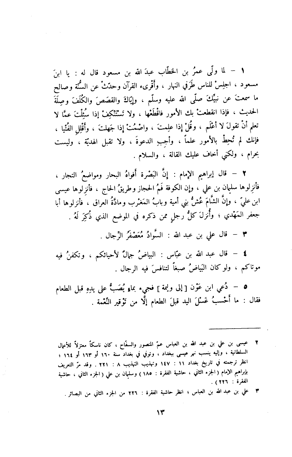 قال إبراهيم الإمام: إن البصرة أفواه البحار ومواضع التجار، فأنزلوها سليمان بن علي، وإن الكوفة فم الحجاز وطريق الحاج، فأنزلوها عيسى بن علي، وإن الشام عش بني أمية وباب المغرب ومادة العراق، فأنزلوها أبا جعفر المهدي؛ وأنزل كل رجل ممن ذكره في الموضع الذي ذكر له.
