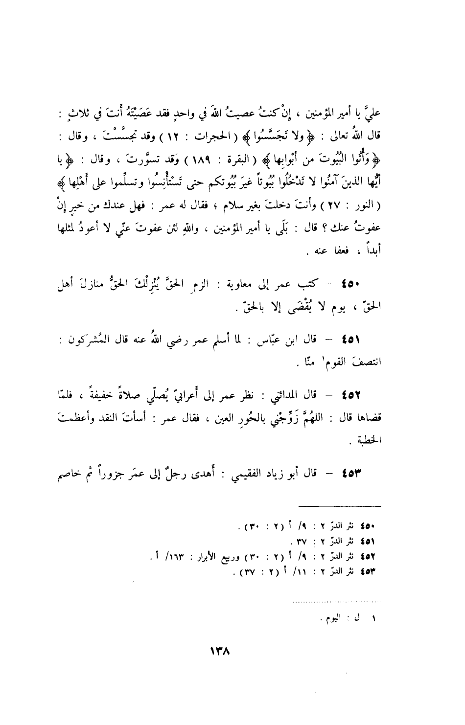 علي يا أمير المؤمنين، إن كنت عصيت اللهفي واحد فقد عصيته أنت في ثلاث: قال الله تعالى: " ولا تجسسوا " الحجرات: 12 وقد تجسست، وقال: " وأتوا البيوت من أبوابها " البقرة: 189 وقد تسورت، وقال: " يا أيها الذين آمنوا لا تدخلوا بيوتا غير بيوتكم حتى تستأنسوا وتسلموا على أهلها " النور: 27 وأنت دخلت بغير سلام؛ فقال له عمر: فهل عندك من خير إن عفوت عنك؟ قال: بلى يا أمير المؤمنين، والله لئن عفوت عني لا أعود لمثلها أبداً، فعفا عنه.
