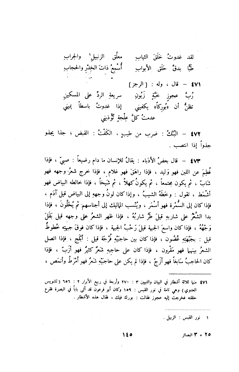 قال بعض الأدباء: يقال للإنسان ما دام رضيعاً: صبي، فإذا فطم عن اللبن فهو وليد، فإذا راهق فهو غلام، فإذا خرج شعر وجهه فهو شاب، ثم يكون مجتمعاً، ثم يكون كهلاً، ثم شيخاً، فإذا خالطه البياض فهو أشمط، تقول: وخطه الشيب، وإذا كان لون وجهه إلى البياض قيل آدم، فإذا كان إلى السمرة فهو أسمر، وينسب المماليك إلى أجناسهم ثم يخلون، فإذا بدا الشعر على شاربه قيل طر شاربه، فإذا ظهر الشعر على وجهه قيل بقل وجهه، فإذا كان واسع الجبهة قيل رحب الجبهة، فإذا كان فوق جبهته خطوط قيل: بجبهته غضون، فإذا كان بين حاجبيه فرجة قيل: أبلج، فإذا اتصل الشعر بينهما فهو مقرون، فإذا كان على حاجبه شعر كثير فهو أزب، فإذا كان الحاجب سابغاً فهو أزج، فإذا لم يكن على حاجبيه شعر فهو أمرط وأنمص،