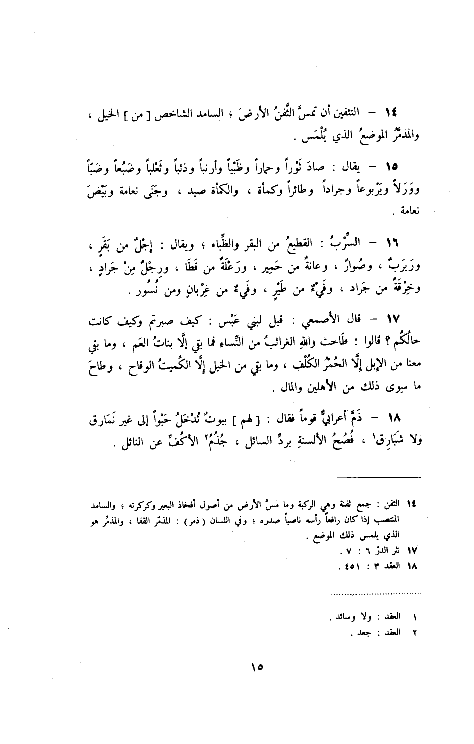 يقال: صاد ثوراً وحماراً وظبياً وأرنباً وذئباً وثعلباً وضبعاً وضباً وورلاً ويربوعاً وجراداً وطائراً وكمأة، والكمأة صيد، وجنى نعامة وبيض نعامة.