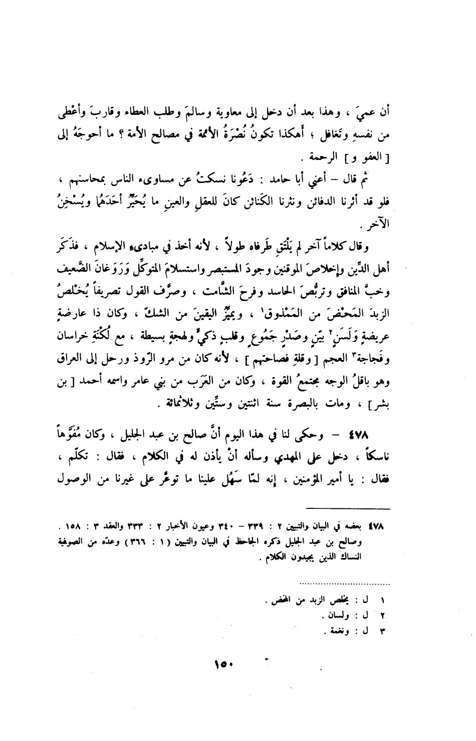 وقال كلاماً آخر لم يلتق طرفاه طولاً، لأنه أخذ في مبادئ الإسلام، فذكر أهل الدين وإخلاص الموقنين وجود المستبصر واستسلام المتوكل وروغان الضعيف وخب المنافق وتربص الحاسد وفرح الشامت، وصرف القول تصريفاً يخلص الزبد المحض من الممذوق، ويميز اليقين من الشك، وكان ذا عارضة عريضة ولسن بين وصدر جموع وقلب ذكي ولهجة بسيطة، مع لكنة خراسان وفجاجة العجم وقلة فصاحتهم، لأنه كان من مرو الروذ ورحل إلى العراق وهو باقل الوجه مجتمع القوة، وكان من العرب من بني عامر واسمه أحمد بن بشر، ومات بالبصرة سنة اثنتين وستين وثلايمائة.