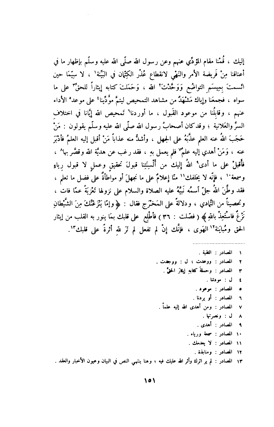 إليك، قمنا مقام المؤدي عنهم وعن رسول الله صلى الله عليه وسلم بإظهار ما في أعناقنا من فريضة الأمر والنهي لانقطاع عذر الكتمان في البينة، لا سيما حين اتسمت بميسم التواضع ووحدت الله، وحملت كتابه إيثاراً للحق على ما سواه، فجمعنا وإياك مشهد من مشاهد التحميص ليتم مؤدينا على موعد الأداء عنهم، وقابلنا من موعود القبول، ما أوردنا تحميص الله إيانا في اختلاف السر والعلانية؛ وقد كان أصحاب رسول الله صلى الله عليه وسلم يقولون: من حجب الله عنه العلم عذبه على الجهل، وأشد مه عذاباً من أقبل إليه العلم فأدبر عنه، ومن أهدي إليه علم فلم يعمل به، فقد رغب عن هدية الله وقصر بها، فأقبل على ما أدى الله إليك من ألسنتنا قبول تحقيق وعمل لا قبول رياء وسمعة، فإنه لا يخلفك منا إعلام على ما نجهل أو مواطأة على فضل ما تعلم، فقد وطن الله جل اسمه نبيه عليه الصلاة والسلام على تزولها تعزية عما فات، وتحصيناً من التمادي، ودلالة على المخرج فقال: " وإما ينزغنك من الشيطان نزغ فاستعذ بالله " فصلت: 36 فأطلع على قلبك بما ينور به القلب من إيثار الحق ومباينة الهوى، فإنك إن لم تفعل لم تر لله أثرة على قلبك.