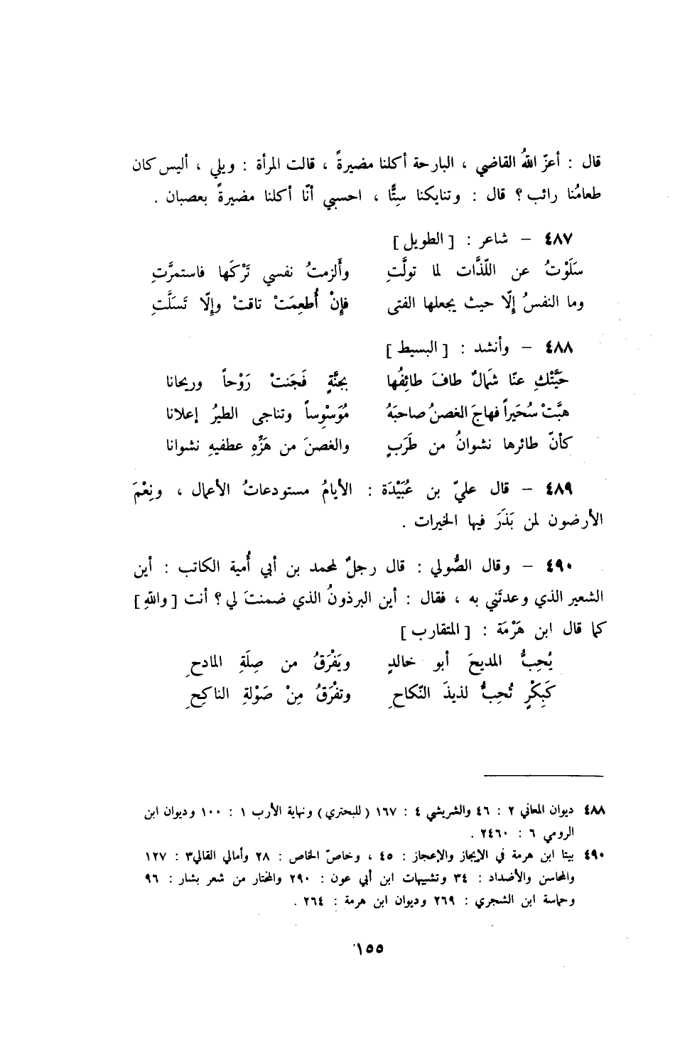 وقال الصولي: قال رجل لمحمد بن أبي أمية الكاتب: أين الشعير الذي وعدتني به، فقال: أين البرذون الذي ضمنت لي؟ أنت والله كما قال ابن هرمة: المتقارب
