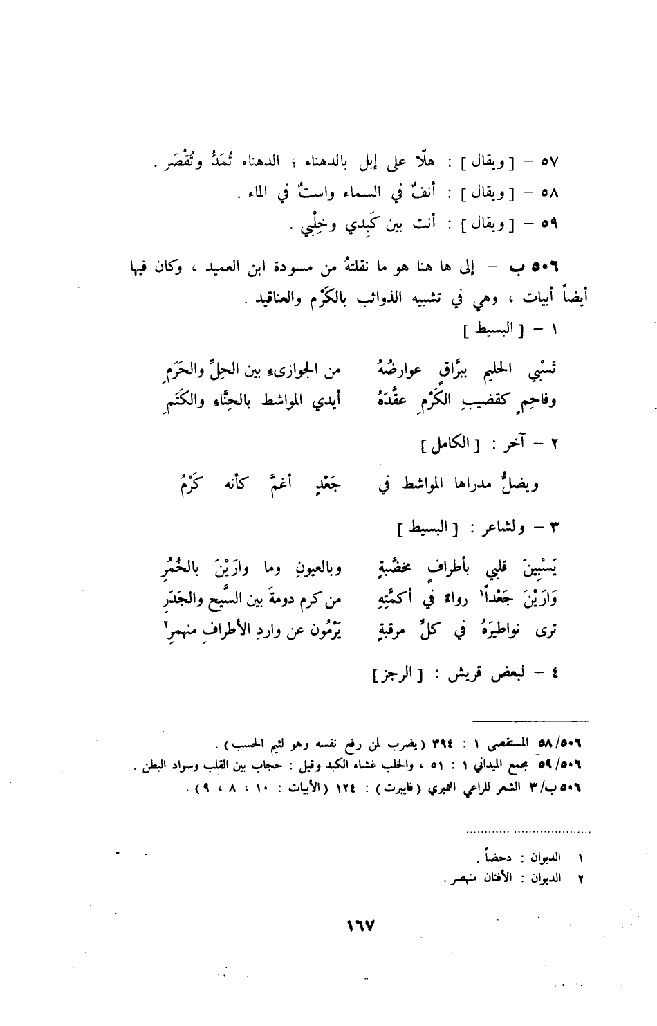 إلى ها هنا هو ما نقلته من مسودة ابن العميد، وكان فيها أيضاً أبيات، وهي في تشبيه الذوائب بالكرم والعناقيد.