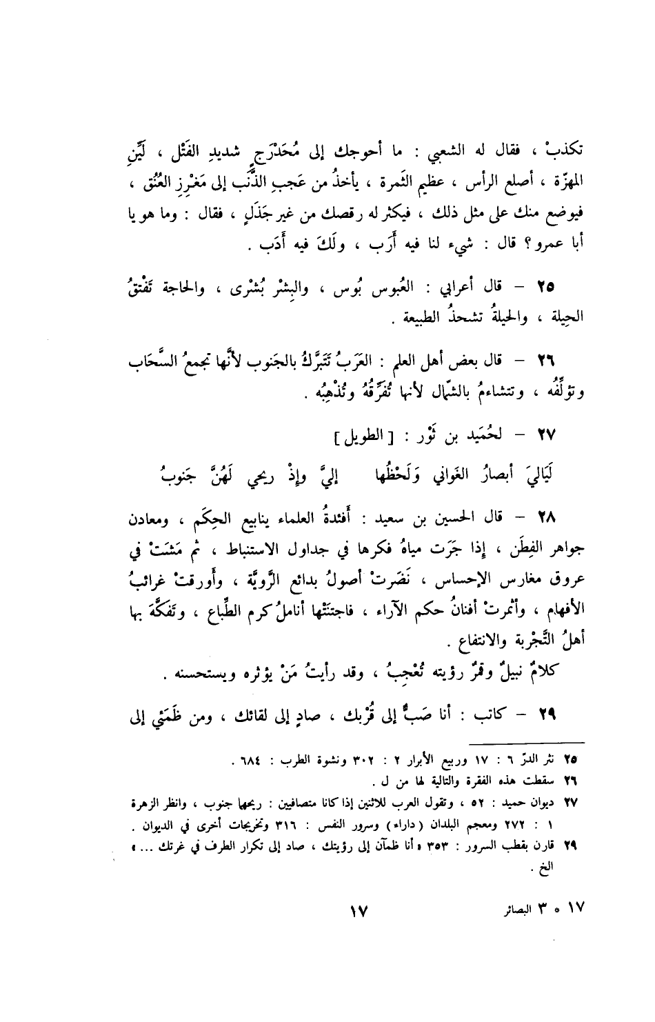 قال الحسين بن سعيد: أفئدة العلماء ينابيع الحكم، ومعادن، جواهر الفطن، إذا جرت مياه فكرها في جداول الاستنباط، ثم مشت في عروق مغارس الإحساس، نضرت أصول بدائع الروية، وأورقت غرائب الأفهام، وأثمرت أفنان حكم الآراء، فاجتنبها أنامل كرم الطباع، وتفكه بها أهل التجربة والانتفاع.