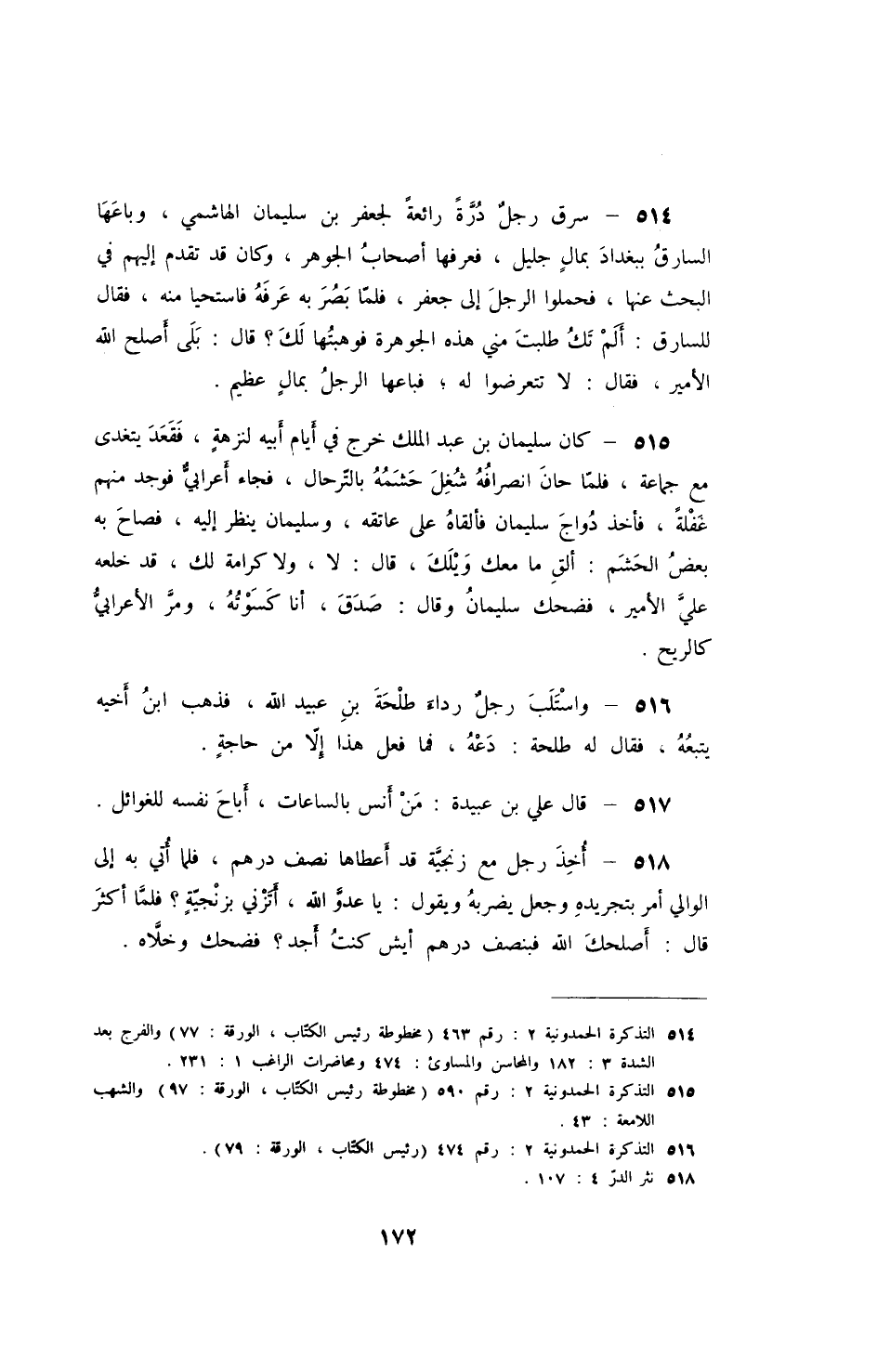 سرف رجل درة رائعة لجعفر بن سليمان الهاشمي، وباعها السارق ببغداد بمال جليل، فعرفها أصحاب الجوهر، وكان قد تقدم إليهم في البحث عنها، فحملوا الرجل إلى جعفر، فلا بصر به عرفه فاستحيا منه، فقال للسارق: ألم تك طلبت مني هذه الجوهرة فوهبتها لك؟ قال: بلى أصلح الله الأمير، فقال: لا تتعرضوا له؛ فباعها الرجل بمال عظيم.