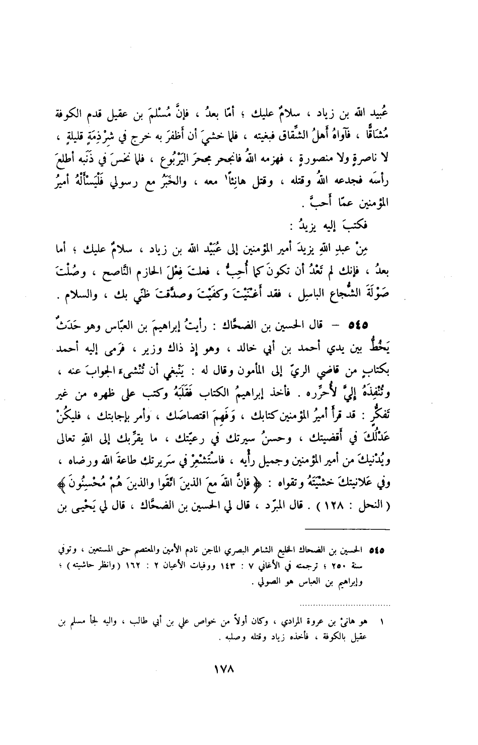 عبيد الله بن زياد، سلام عليك؛ أما بعد، فإن مسلم بن عقيل قدم الكوفة مشاقا، فآواه أهل الشقاق فبغيته، فلما خشي أن أظفر به خرج في شرذمة قليلة، لا ناصرة ولا منصورة، فهزمه الله فانجحر مجحر اليربوع، فلما نخس في ذنبه أطلع رأسه فجدعه الله وقتله، وقتل هانئاً مع، والخبر مع رسولي فليسأله أمير المؤمنين عما أحب.