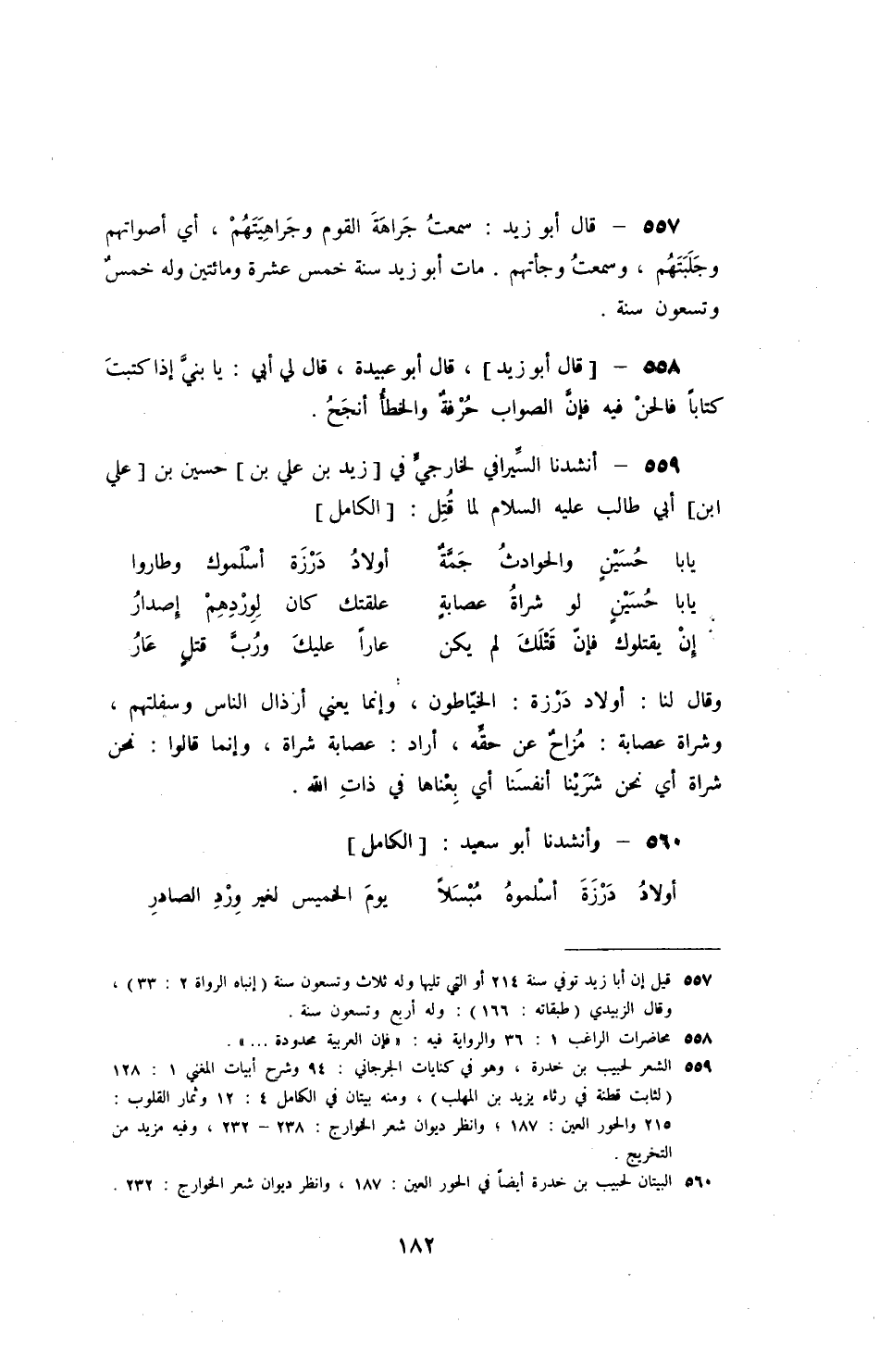وقال لنا: أولاد درزة: الخياطون، وإنما يعني أرذال الناس وسفلتهم، وشراة عصابة: مزاح عن حقه، أراد: عصابة شراة، وإنما قالوا: نحن شراة أي نحن شرينا أنفسنا أي بعناها في ذات الله.