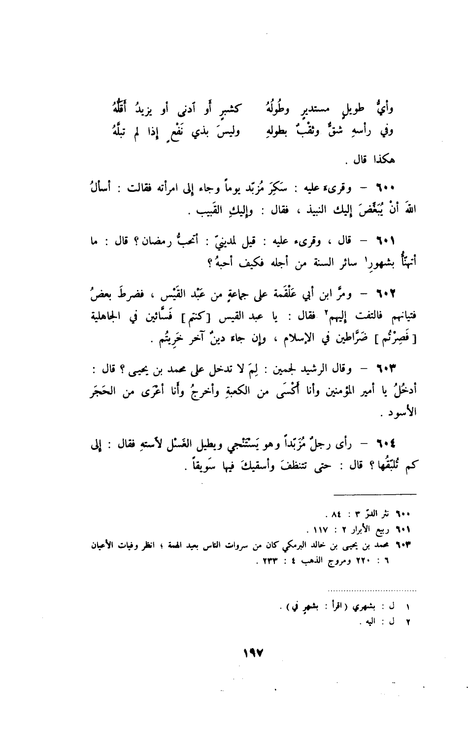 قال، وقرئ عليه: قيل لمديني: أتحب رمضان؟ قال: ما أتهنأ بشهور سائر السنة من أجله فكيف أحبه؟ ومر ابن أبي علقمة على جماعة من عبد القيس، فضرط بعض فتيانهم فالتفت إليهم فقال: يا عبد القيس كنتم فسائين في الجاهلية فصرتم ضراطين في الإسلام، وإن جاء آخر خريتم.